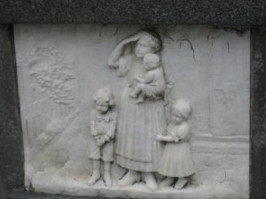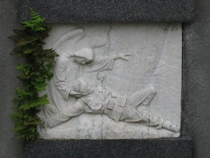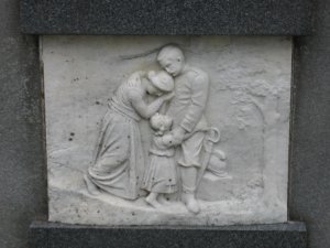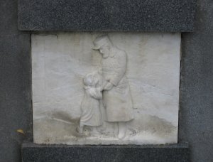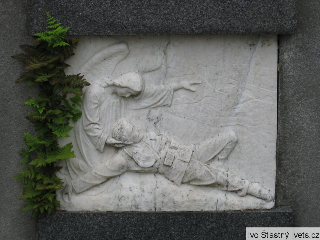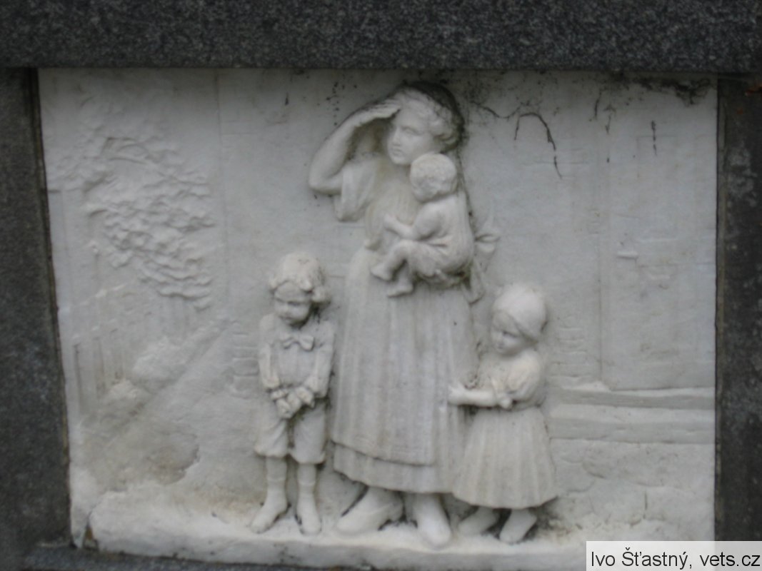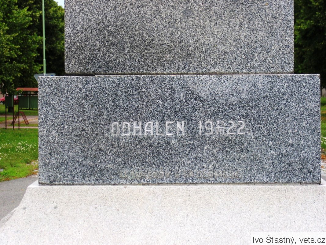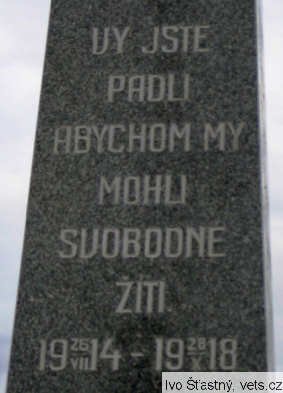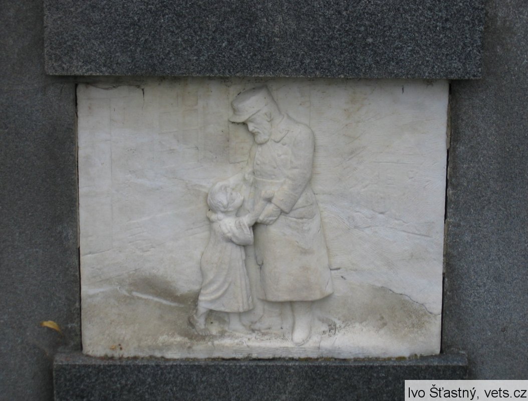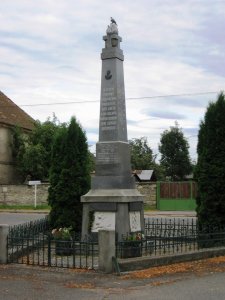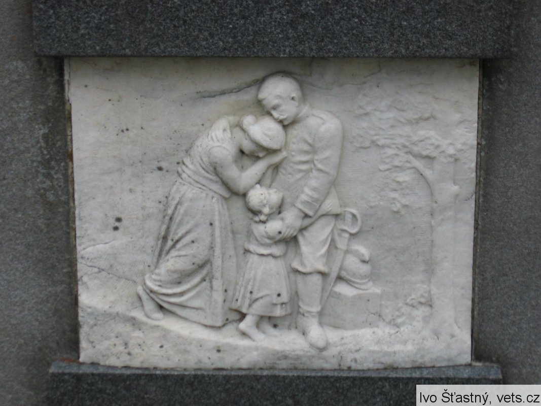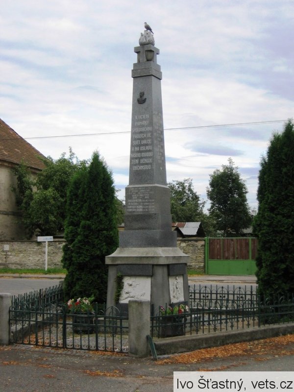 Pomník odhalen 22/VII 1922. Reliéfy znázorňují: Loučení, Umírající vojín na bojišti, Marné čekání, Návrat. Pomník postavil sochař V. Semerák a spol. z Olomouce.