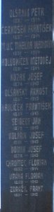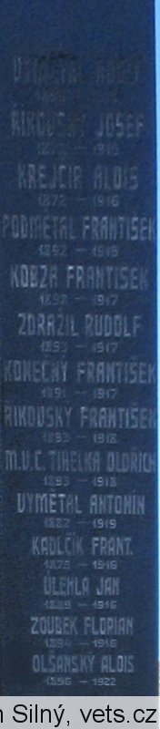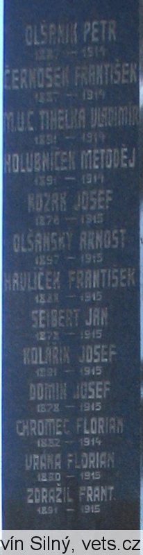 VYMĚTAL ADOLF 1896 - 1915, ŘÍKOVSKÝ JOSEF1878 - 1915, KREJČÍŘ ALOIS, PODMĚTAL FRANTIŠEK 1898 - 1916, KOBZA FRANTIŠEK 1898 - 1917, ZDRAŽIL RUDOLF 1895 - 1917, KONEČNÝ FRANTIŠEK 1893 - 1917, ŘÍKOVSKÝ FRANTIŠEK 1893 - 1918, M.U.C. TIHELKA OLDŘICH 1893 - 1918, VYMĚTAL ANTONÍN 1887 - 1919, KADLČÍK FRANTIŠEK 1875 - 1916, ÚLEHLA JAN 1889 - 1916, ZOUBEK FLORIAN 1894 - 1916, OLŠANSKÝ ALOIS 1896 - 1922, OLŠANÍK PETR 1887 - 1914, ČERNOŠEK FRANTIŠEK 1887 - 1914, M.U.C. TIHELKA VLADIMÍR 1891 - 1914, HOLUBNÍČEK METODĚJ 1891 - 1914, KOZÁK JOSEF 1878 - 1915, OLŠANSKÝ ARNOŠT 1897 -1915, HAVLÍČEK FRANTIŠEK 1888 - 1915, SIEBERT JAN 1878 - 1915, KOLÁŘÍK JOSEF 1891 - 1915, DOMIN JOSEF 1878 - 1915, CHROMEC FLORIAN 1882 - 1914, VRÁNA FLORIAN 1880 - 1915, ZDRAŽIL FRANTIŠEK 1891 - 1915