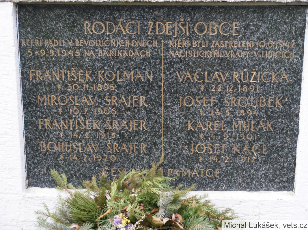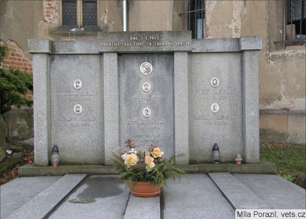 Společný hrob chlapců zastřelených německými vojáky v květnu 1945 na poli u Středokluk (tam je pomníček u silnice ke Kněževsi). Data narození Jiřího Kácla, Ladislava Tichého a Václava Rusňáka nesouhlasí s daty na výše zmíněném pomníčku u silnice, navíc není uveden Václav Kompit.