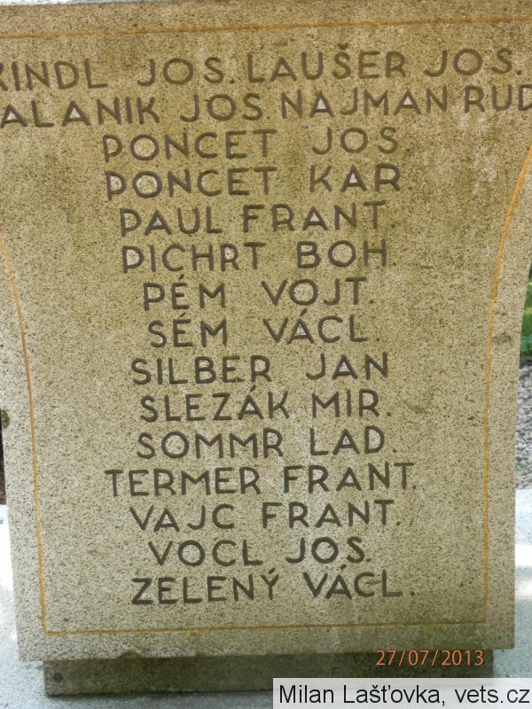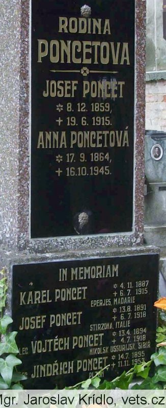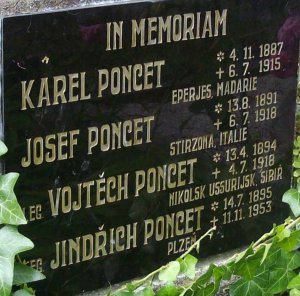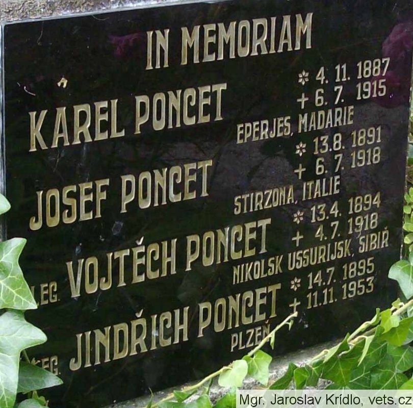 Poncet Vojtěch, nar. 13.4.1894, Ročov, okres Louny. V RU armádě sloužil u 92. pěšího pluku jako vojín. Zajat 15.9.1915, Počajev. Do ČS legií v Rusku se přihlásil v Charcisk - Donská oblast, zařazen 30.11.1917 jako vojín 8. střeleckého pluku. Padl 4.6.1918 Nikolsk Ussurijskij, pohřben tamtéž.