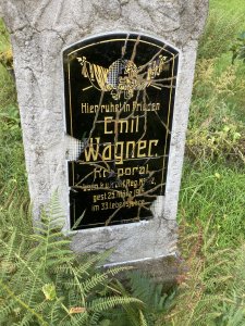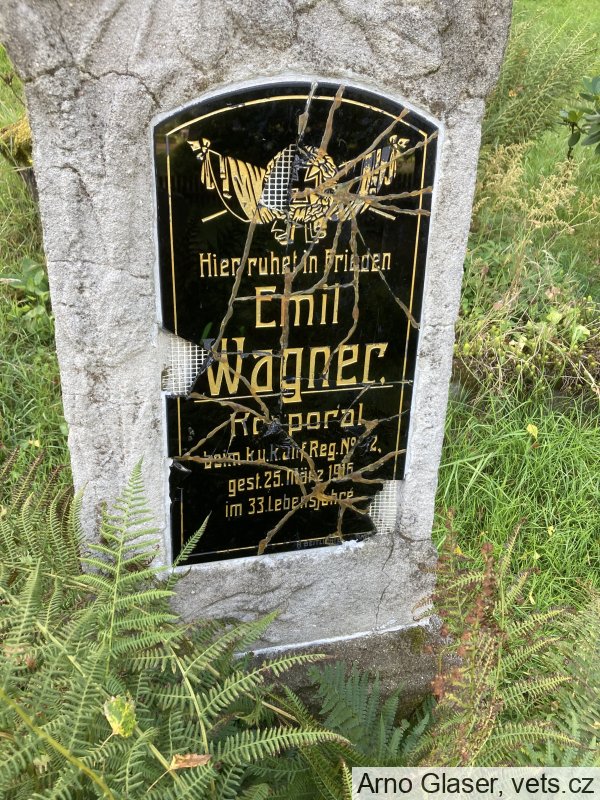 Wagner Emil: *2.12.1883, místo neuvedeno. Příslušný Schemmel (Všemily). Povolání: soustružník. ResKorp., IR. Nr. 42, 1. ErsKomp. +25.3.1916 Hinterhermsdorfer Flur, Sebnitz, Sasko, Německo. Střelné zranění na hlídkovém stanovišti. Převezen a 30.3.1916 zde pohřben.