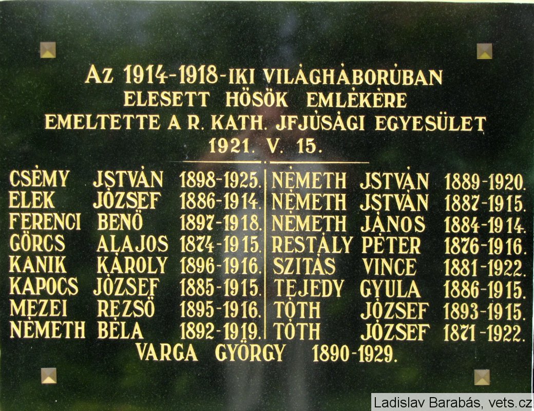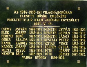 CSÉMY JSTVÁN 1898 – 1925, ELEK JÓZSEF 1886 – 1914, FERENCI BENŐ 1897 – 1918, GŐRCS ALAJOS 1874 – 1915, KANIK KÁROLY 1896 – 1916, KAPOCS JÓZSEF 1885 – 1915, MEZEI REZSŐ 1895 -1916, NÉMETH BÉLA 1892 – 1919, NÉMETH JSTVÁN 1889 – 1920, NÉMETH JSTVÁN 1887 – 1915, NÉMETH JÁNOS 1884 -1914, RESTÁLY PÉTER 1876 – 1916, SZITÁS VINCE 1881 – 1922, TESEDY GYULA 1886 – 1915, TÓTH JÓZSEF 1893 – 1915, TÓTH JÓZSEF 1871 – 1922, VARGA GYÖRGY 1890 – 1929