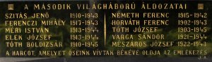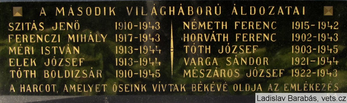 SZITÁS JENÖ 1910 -1943, FERENCZI MIHÁLY 1917 – 1043, MÉRI ISTVÁN 1913 – 1944, ELEK JÓZSEF 1913 – 1944, TÓTH BOLDIZSÁR 1910 – 1945, NÉMETH FERENC 1915 – 1042, HORVÁTH FERENC 1902 – 1943, TÓTH JÓZSEF 1903 – 1945, VARGA SÁNDOR 1921 – 1944, MÉSZÁROS JÓZSEF 1922 – 1943