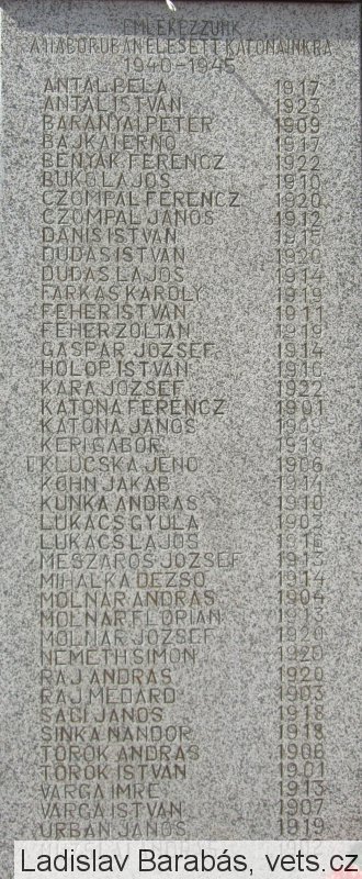 ANTAL BÉLA 1917, ANTAL ISTVÁN 1923, BARANYAI PÉTER 1909, BAJKAI ERNÖ 1917, BENYAK FERENCZ 1922, BUKO LAJOS 1910, CZOMPÁL FERENCZ 1920, CZOMPÁL JÁNOS 1912, DANIS ISTVÁN 1915, DUDÁS ISTVÁN 1920, DUDÁS LAJOS 1914, FARKAS KÁROLY 1919, FEHÉR ISTVÁN 1911, FEHÉR ZOLTÁN 1919, GÁSPÁR JÓZSEF 1914, HOLOP ISTVÁN 1916, KARA JÓZSEF 1922, KATONA FERENCZ 1901, KATONA JÁNOS 1909, KERI GÁBOR 1919, KLUCSKA JENŐ 1906, KOHN JAKAB 1914, KUNKA ANDRÁS 1910, LUKÁCS GYULA 1903, LUKÁCS LAJOS 1916, MÉSZÁROS JÓZSEF 1913, MIHALKA DEZSO 1914, MOLNÁR ANDRÁS 1904, MOLNÁR FLÓRIÁN 1913, MOLNÁR JÓZSEF 1920, NÉMETH SIMON 1920, RAJ ANDRÁS 1920, RAJ MEDARD 1903, SÁGI JÁNOS 1918, SINKA NÁNDOR 1918, TÖRÖK ANDRÁS 1906, TÖRÖK ISTVÁN 1901, VARGA IMRE 1913, VARGA ISTVÁN 1907, URBÁN JÁNOS 1919, MUZSLAI ANDRÁS 1902