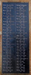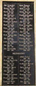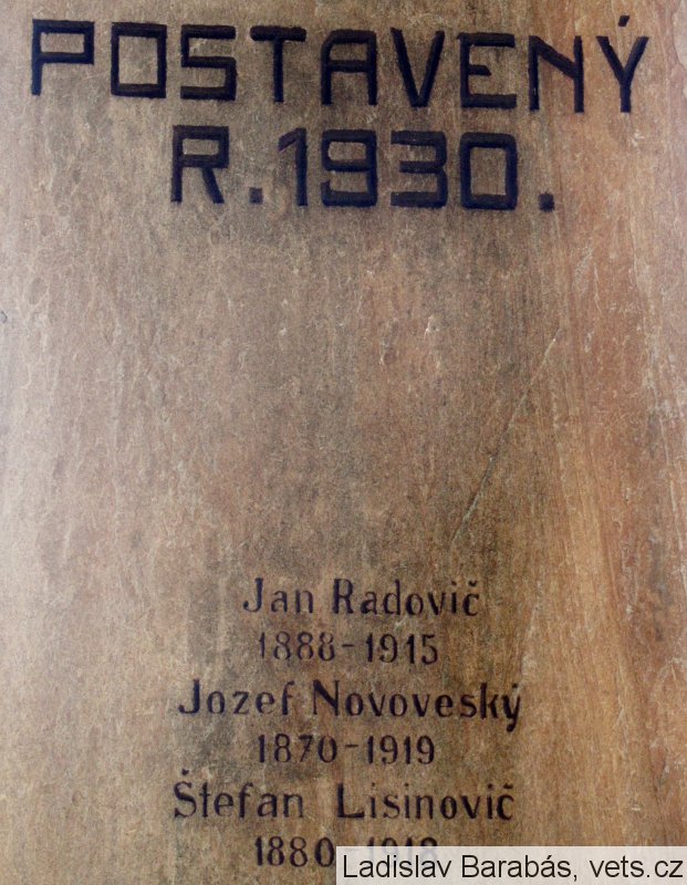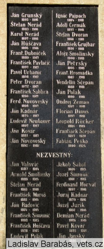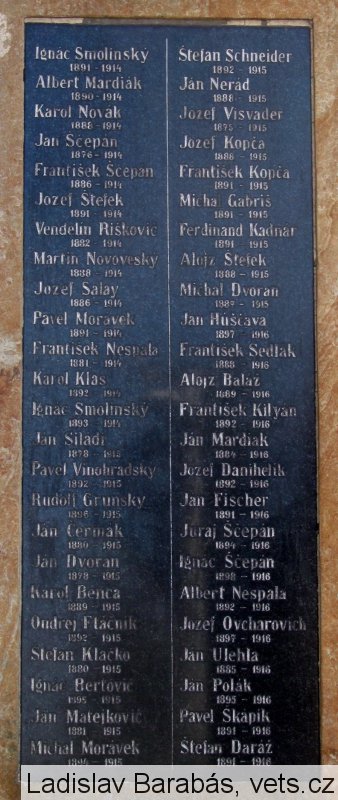 Ignác Smolinský 1891-1914, Albert Mardiák 1890-1914, Karol Novák 1888-1914, Jan Ščepán 1876-1914, František Ščepán 1886-1914, Jozef Štefek 1891-1914, Vendelín Riškovič 1882-1914, Martin Novoveský 1888-1914, Jozef Salay 1886-1914, Pavel Morávek 1891-1914, František Nespala 1881-1914, Karol Klas 1892-1914, Ignác Smolinský 1893-1914, Ján Siládi 1878-1915, Pavel Vinohradský 1892-1915, Rudolf Grunsky 1896-1915, Ján Čermák 1880-1915, Ján Dvoran 1878-1915, Karol Benca 1889-1915, Ondrej Ftáčnik 1892-1915, Štefan Klačko 1880-1915, Ignác Bertovič 1895-1915, Ján Matejkovič 1881-1915, Michal Morávek 1894-1915, Štefan Schneider 1892-1915, Ján Nerád 1888-1915, Jozef Visváder 1875-1915, Jozef Kopča 1888-1915, František Kopča 1891-1915, Michal Gabriš 1891-1915, Ferdinand Kadnár 1891-1915, Alojz Štefek 1888-1915, Michal Dvoran 1887-1915, Ján Húščava 1897-1916, František Sedlák 1888-1916, Alojz Baláž 1889-1916, František Kilyán 1892-1916, Ján Mardiak 1884-1916, Jozef Danihelík 1892-1916, Ján Fischer 1891-1916, Juraj Ščepán 1894-1916, Ignác Ščepán 1898-1916, Albert Nespala 1892-1916, Jozef Ovcharovich 1897-1916, Ján Ulehla 1885-1916, Ján Polák 1895-1916, Pavel Škápík 1891-1916, Štefan Daráž 1891-1916, Ján Grunský 1893-1916, Štefan Nerád 1883-1916, Karol Nerád 1897-1916, Ján Húščava 1896-1916, Frant. Dubníček 1889-1917, František Pavlačič 1897-1917, Pavel Urbanič 1898-1917, Peter Dvoran 1872-1917, František Šablica 1880-1917, Ferd. Novoveský 1896-1917, Ján Kadnár 1874-1917, Ľudevit Neubauer 1897-1917, Ján Kovár 1881-1917, Ján Novoveský 1892-1918, Ignác Pajpach 1884-1918, Adolf Čermák 1897-1918, Štefan Dvoran 1868-1918, František Grujbar 1891-1918, Alojz Smolinský 1900-1918, Ján Petrský 1895-1918, Frant. Hromádka 1887-1918, Vendelin Ščepán 1888-1918, Ján Polák 1880-1918, Ondrej Zeman 1897-1918, Florian Dinuš 1897-1918, Leopold Rücker 1886-1919, František Ščepán 1897-1920, Fabián Peško 1890-1924