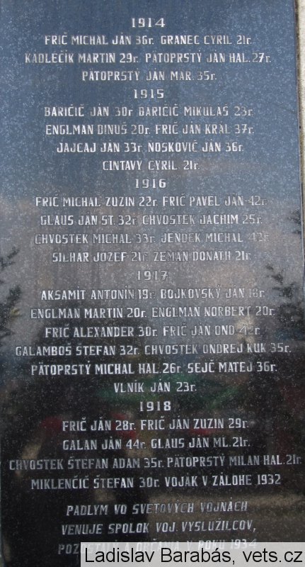 AKSAMÍT ANTONÍN 19 r., BOJKOVSKÝ JÁN 18 r., ENGELMAN MARTIN 20 r., ENGELMAN NORBERT 20 r., FRIČ ALEXANDER 30 r., FRIČ JÁN OND. 42 r., GALAMBOŠ ŠTEFAN 32 r., CHVOSTEK ONDREJ KUK 35 r., PÄTOPRSTÝ MICHAL HAL. 26 r., SEJČ MATEJ 36 r., VLNˇIK JÁN 23 r.,