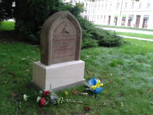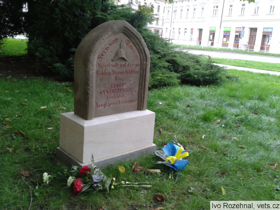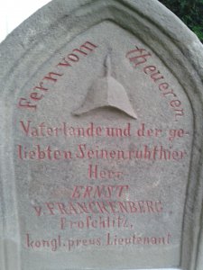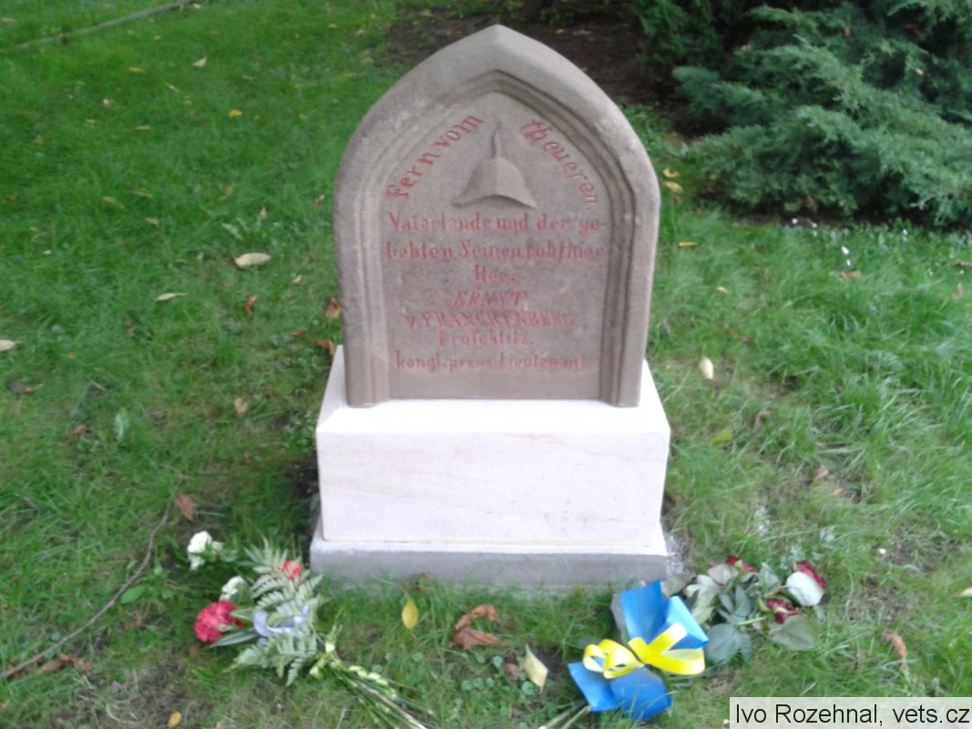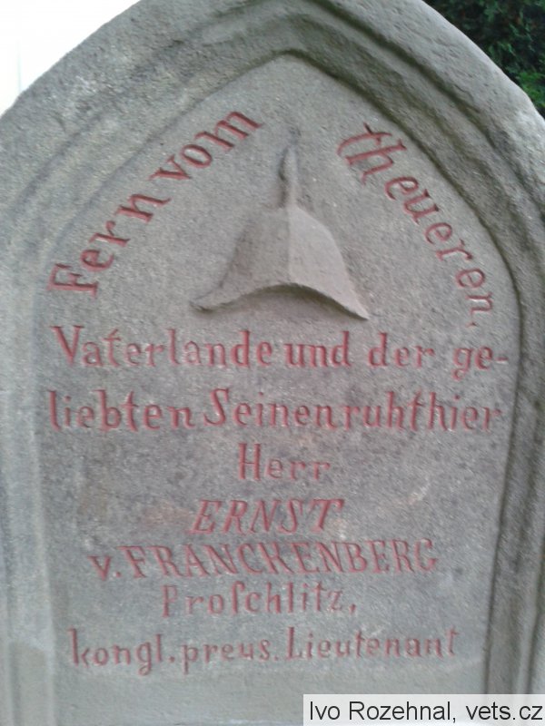 Ernst von Frankenberger - Proschlitz se narodil v Kalingradě (vých. Prusko). R. 1866 sloužil jako poručík a plukovní adjuntant. Dne 27. 6. 1866 se účastnil bitvy u Trutnova, 3. 7. 1866 u Hradce Králové a 15. 7. 1866 u Tovačova. Záhy onemocněl tyfem a zemřel 27. 8. 1866 v klášteře Milosrdných bratří v Prostějově. Zde byl pohřben a náhrobek zhotovil jeho pluk. V průběhu let byl hřbitov zrušen a náhrobek ztracen. Objeven byl r. 2011 u soukromého sběratele. Po jednání s Komitétem pro udržování památek z války roku 1866 byl získán, opraven a umístěn v parčíku před klášterem.