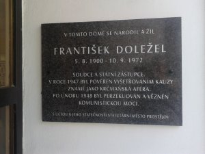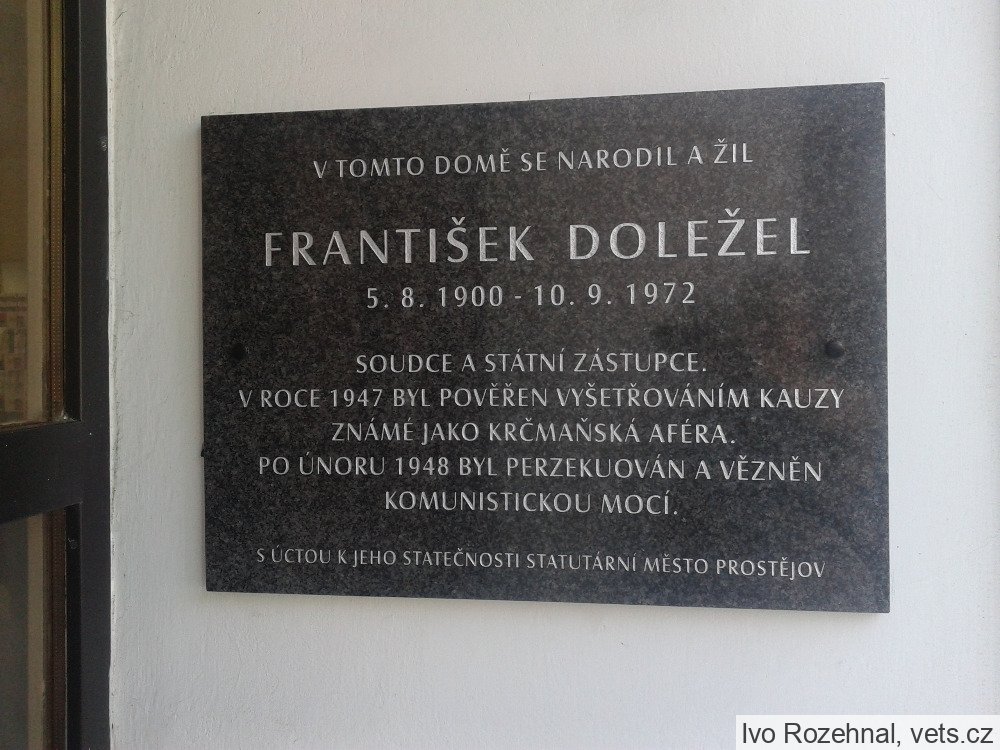 Pamětní deska byla slavnostně odhalena 27.6.2019. Krčmaňská aféra či krabičkový atentát byl skandál z roku 1947. Šlo o neúspěšný pokus o atentát na ministry vlády Petra Zenkla, Jana Masaryka a Prokopa Drtinu. Iniciátory byli členové KSČ, pod vedením ministra vnitra Noska. Krabice vyrobil Jan Kopka z Krčmaně u Olomouce na příkaz krajského sekretariátu KSČ v Olomouci. Výbušniny pak aktivoval poslanec Jaroslav Jura Sosnar. V průběhu vyšetřování byly nalezeny i tři sklady munice a zbraní. Veřejné přelíčení mělo proběhnout v březnu 1948, ale pro Vítězný únor byla celá aféra zrušena a přepracována na spiknutí národních socialistů. Zatčeni byli mimo soudce Doležela např. i Zdeněk Marjanko, František Kolava a další.