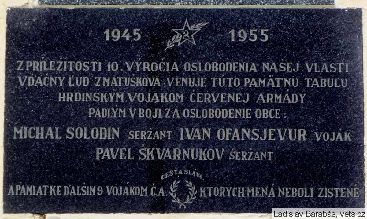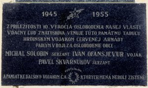 MICHAL SOLODIN SERŽANT IVAN OFANSJEVUR VOJÁK PAVEL ŠKVARNUKOV SERŽANT A PAMIATKE ĎALŠÍM 9 VOJÁKOM Č.A. KTORÝCH MENÁ NEBOLI ZISTENÉ