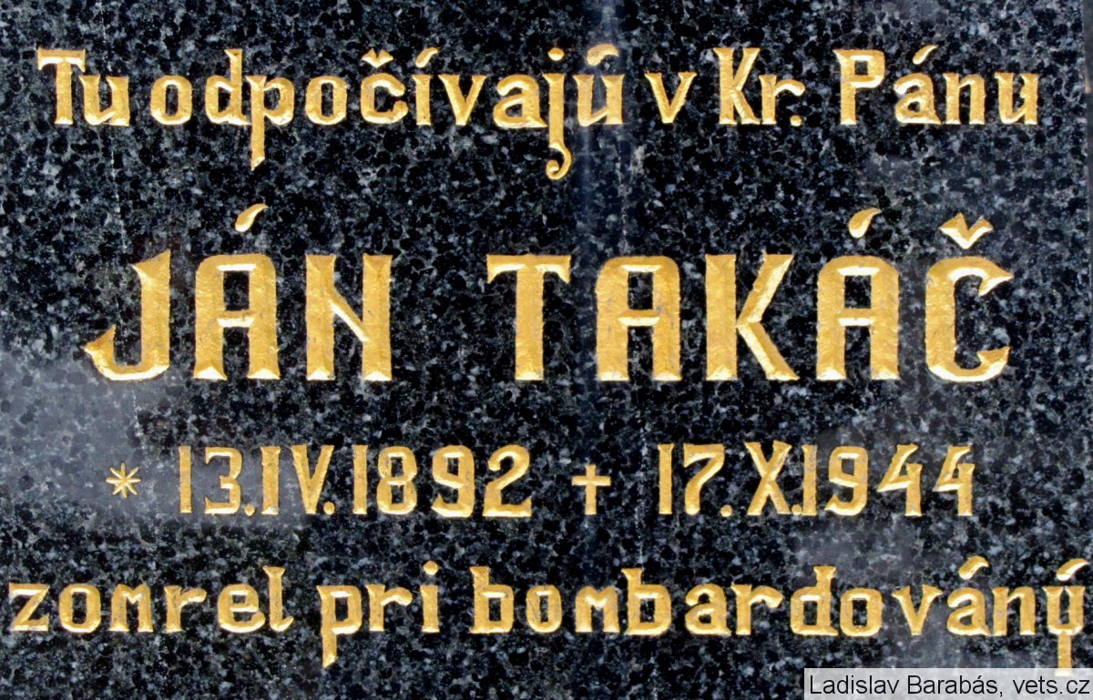 Dňa 17.10.1944 prelietali cez juhozápadné Slovensko bombardéry americkej 15. leteckej armády na ciele v Nemecku. Keď leteli nad Šintavou, zhodili na železničný most cez Váh 5 bômb. Bomby netrafili cieľ, úplne však zničili 12 domov. Zahynuli pritom dvaja ľudia a ďalší boli ľahko i ťažko ranení. Okrem Jána Takáča zahynul aj osemročný Paľko Novák, ktorý má hrob vľavo od neho.