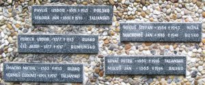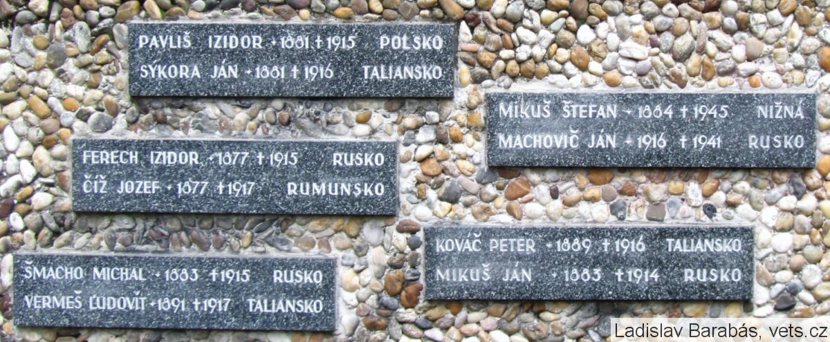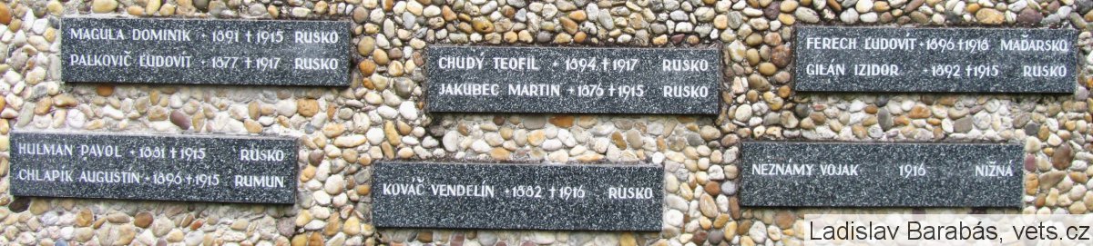 PAVLIŠ IZIDOR *1881 †1915 POĽSKO, SÝKORA JÁN *1881 †1916 TALIANSKO, FERECH IZIDOR *1877 †1915 RUSKO, ČÍŽ JOZEF *1877 †1917 RUMUNSKO, ŠMACHO MICHAL *1883 †1915 RUSKO, VERMEŠ ĽUDOVÍT *1891 †1917 TALIANSKO, MIKUŠ ŠTEFAN *1884 †1945 NIŽNÁ, MACHOVIČ JÁN *1916 †1941 RUSKO, KOVÁČ PETER *1889 †1916 TALIANSKO, MIKUŠ JÁN *1883 †1914 RUSKO, MAGULA DOMINIK *1891 †1915 RUSKO, PALKOVIČ ĽUDOVÍT *1877 †1917 RUSKO, HULMAN PAVOL *1881 †1915 RUSKO, CHLAPÍK AUGUSTÍN *1896 †1915 RUMUN., CHUDÝ TEOFIL*1894 †1917 RUSKO, JAKUBEC MARTIN *1876 †1915 RUSKO, KOVÁČ VENDELÍN *1882 †1916 RUSKO, FERECH ĽUDOVÍT *1896 †1918 MAĎARSKO, GILÁN IZIDOR *1892 †1915 RUSKO, NEZNÁMY VOJAK 1916 NIŽNÁ
