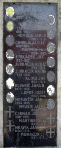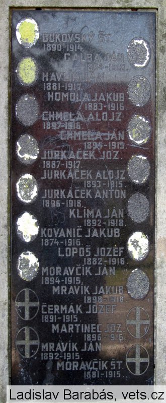 BUKOVSKÝ ŠT. 1890-1914. GALBAVÝ JÁN 1894-1918. HAVLÍK JÁN 1881-1917. HOMOLA JAKUB 1883-1916. CHMELA ALOJZ 1897-1916. CHMELA JÁN 1894-1915. JURKÁČEK JOZ. 1887-1917. JURKÁČEK ALOJZ 1893-1915. JURKÁČEK ANTON 1896-1918. KLÍMA JÁN 1892-1918. KOVANIČ JAKUB 1874-1916. LOPOŠ JOZEF 1882-1916. MORAVČÍK JÁN 1894-1915. MRAVÍK JAKUB 1898-1918. ČERMÁK JOZEF 1891-1915. MARTINEC JOZ. 1896-1916
