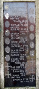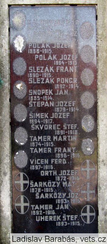 MRAVÍK JÁN 1892-1915. MORAVČÍK ŠT. 1881-1915. MALINOVSKÝ MAR. 1877-1915. MORAVČÍK JOZ. 188-1914. POLÁK JOZEF 1888-1915. SLEZÁK FRANT. 1890-1915. SLEZÁK PONGR. 1892-1914. SNOPEK JÁN 1885-1914. ŠTEPÁN JOZEF 1879-1914. ŠIMEK JOZEF 1894-1917. ŠKVOREC ŠTEF. 1891-1918. TAMER MARTIN 1874-1915. TAMER FRANT. 1896-1916. VICEN FERD. 1897-1916. ORTH JOZEF 1872-1916. ŠARKÖZY MAT. 1878-1915. ŠARKÖZY JOZ. 1893-1916. TAMER JÁN 1892-1916. UHEREK ŠTEF. 1893-1915.