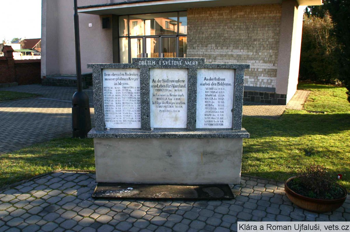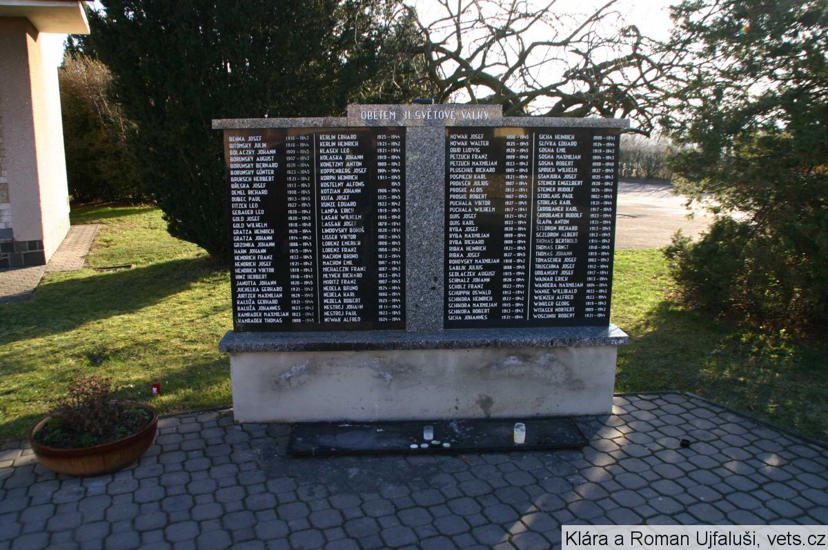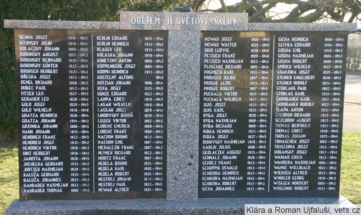 ADAMETZ JOSEF 1916-1945, ALKER KAREL 1912-1942, BIA ALFONS 1924-1945, BLOKEŠ MAXMILIÁN 1919-1943, BÖHM JAKUB 1920-1944, BŐHM JOSEF 1926-1944, DEHNANN GERHARD 1924-1944, DEHNANN LEONARD 1926-1944, DVOŘÁK JOSEF 1923-1945, DVOŘÁK ROBERT 1926-1945, GRANZER FRANTIŠEK 1906-1945, GRANZER JOSEF 1906-1945, HARTMANN LEOPOLD 1912-1945, HOHEISEL LEOPOLD 1925-1945, HOLLESCH ANDĚLÍN 191913-1945, HOMOLA EMRICH 1910-1943, CHALUPA JOHANN 1915-1940, JAŘÁB ERICH 1927-1945, JURCZEK ERICH 1926-1945, JURČEK AUGUSTIN 1908-1945, KLÍMEK ERICH 1920-1943, KLÍMEK GEORG 1914-1944, KLÍMEK JOSEF 1928-1945, KLÍMEK ROBERT 1901-1945, KOPETZ ERICH 1923-1945, KUKOL RAIMUND 1901-1945, MELAR JOSEF 1945, MILLION FRANTIŠEK 1908-1944, NÁVRAT FRANTIŠEK 1909-1943, NOVÁK JOSEF 1922-1944, NOWAK ALFONS 1914-1940, NOVÁK JAN 1910-1942, PLACZEK ALOIS 1925-1944, PLACZEK FRANZ 1924-1944, POSSEL RICHARD 1926-1945, POSTULKA FRANTIŠEK 1908-1945, POŠTULKA JOHANN 1917-1945, REHBEIN GUSTAV 1921-1945, REHBEIN RICHARD 1926-1944, SEDLÁČEK FRANTIŠEK 1924-1945, SEDLÁČEK JOSEF 1921-1943, SCHAFFARTZIK JOSEF 1907-1945, SCHIMETZEK EMERICH 1908-1945, SMIEJA MAXMILIÁN 1919-1945, STANJURA ALFRÉD 1921-1945, ŠKROBÁNEK PAUL 1898-1944, TRULLEY FRANZ 1916-1943, TRULLEY HEINDRICH 1914-1942, TRULLEY ROBERT PÁTER 11-1945, WILTSCH ALOIS 1925-1944, WILTSCH JOHANN 1909-1945, WINÁREK REINHOLD 1923-1942, WOCH PAUL 1917-1942, WOCH TEOFIL 1912-1945