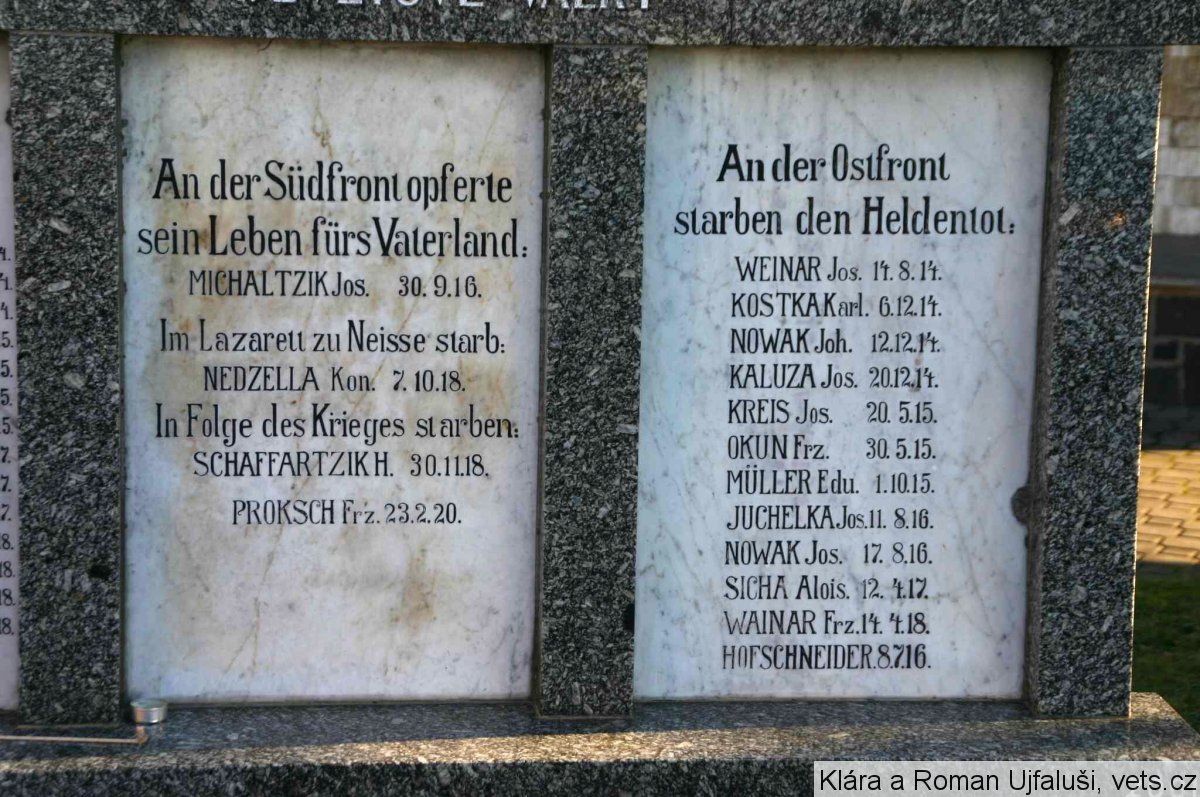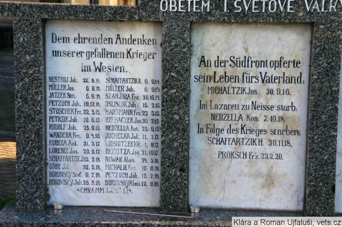 KUNZE EDUARD 1922-1942, LAMPA ERICH 1919-1945, LASAK WILHELM 1916-1940, LASSAK JOSEF 1870-1941, LINDOVSKY BOHUŠ 1920-1941, LISSEK VIKTOR 1902-1945, LORENZ EMERICH 1909-1945, LORENZ FRANZ 1908-1942, MACHON BRUNO 1922-1944, MACHON EMIL 1907-1941, MICHALTZIK FRANZ 1897-1943, MLYNEK RICHARD 1923-1942, MORITZ FRANZ 1907-1945, NEDELA BRUNO 1924-1944, NEDELA KARL 1900-1944, NEDELA ROBERT 1925-1944, NESTROJ JOHANN 1911-1942, NESTROJ PAUL 1923-1945, NOWAK ALFRED 1924-1944, NOWAK JOSEF 1900-1945, NOWAK WALTER 1925-1945, OBID LUDVIG 1929-1945, PETZUCH FRANZ 1909-1940, PETZUCH MAXMILIAN 1923-1943, PLUSCHKE RICHARD 1905-1945, POSPIECH KARL 1921-1944, PROKSCH JULIUS 1907-1944, PROSKE ALOIS 1913-1941, PROSKE ROBERT 1907-1945, PUCHALA VIKTOR 1927-1945, PUCHALA WILHELM 1917-1941, QUIS JOSEF 1921-1942, QUIS KARL 1923-1944, RIBKA HEINRICH 1921-1945, RIBKA JOSEF 1927-1945, RYBA JOSEF 1920-1944, RYBA MAXMILIAN 1909-1944, RYBA RICHARD 1909-1944, ROHOVSKY MAXMILIAN 1910-1942, SABLIK JULIUS 1898-1945, SCHIKORA HEINRICH 1922-1942, SCHIKORA ROBERT 1913-1943, SCHIKORA MAXMILIAN 1915-1944, SCHMALZ JOHANN 1926-1944, SCHOLZ FRANZ 1923-1944, SCHUPPIK OSWALD 1913-1941, SCZEDRON ALBERT 1913-1945, SEDLACZEK AUGUST 1915-1944, SICHA HEINRICH 1909-1941, SICHA JOHANNES 1921-1944, SLIVKA EDUARD 1924-1944, SOSNA EMIL 1919-1942, SOSNA MAXMILIAN 1904-1943, SOSNA ROBERT 1909-1940, SPRUCH WILHELM 1927-1945, STANJURA JOSEF 1925-1943, STEINER ENGELBERT 1920-1942, STEINER RUDOLF 1924-1944, STOKLAHS PAUL 1902-1945, STOKLAS KARL 1921-1944, ŠLAPA ANTON 1921-1944, ŠKROBANEK KARL 1917-1945, ŠKROBANEK RUDOLF 1923-1944, ŠTEDRON RICHARD 1913-1945, THOMAS BERTHOLD 1911-1942, THOMAS ERNST 1910-1945, THOMAS JOHANN 1915-1944, TOMASCHEK JOSEF 1902-1943, TRUSCHINA JOSEF 1912-1944, URBANSKY JOSEF 1917-1941, WAINAR ERICH 1913-1944, WANDERA MAXMILIAN 1904-1944, WANKE WILLIBALD 1922-1942, WIENZEK ALFREED 1923-1944, WINKLER GEORG 1919-1943, WITASEK NORBERT 1905-1942, WOSCHNIK ROBERT 1921-1944