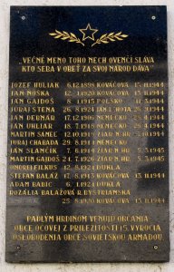 JOZEF HULIAK 6.12.1898 KOVÁČOVÁ 13.11.1944, JÁN NOŠKA 12.1.1920 KOVÁČOVÁ 13.11.1944, JÁN GAJDOŠ 8.1.1915 POLSKO 13.3.1944, JURAJ STENA 26.8.1924 JÁN. LEHOTA 26.9.1944, JÁN DEBNÁR 17.12.1906 NEMECKO 28.4.1944, JÁN UHLIAR 18.7.1918 NEMECKO 28.4.1944, MARTIN SÁMEĽ 12.10.1919 ŽIAR N. HR. 7.10.1944, JURAJ CHABADA NEMECKO, JÁN SLANČÍK 7.6.1914 ŽIAR N. HR. 5.3.1945, MARTIN GAJDOŠ 21.7.1926 ŽIAR N. HR. 5.3.1945, ONDREJ FILKUS 12.8.1921 DUKLA, ŠTEFAN BALÁŽ 17.8.1913 KOVÁČOVÁ 13.11.1944, ADAM BABIC 6.1.1921 DUKLA, ROZÁLIA BALÁŽOVÁ R. BYSTRIANSKÁ 25.8.1920 KOVÁČOVÁ 13.11.1944