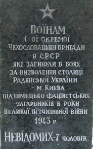 Svida Michal, vojín, nar. 27.10.1915, Kuzmino, okres Mukačevo. Zemřel 7.11.1943, Ukrajina, Nižnaja Duběčnaja, 1. pěší brigáda, tankový prapor, místo zranění Ukrajina, Kyjev, pohřben Nižnaja Dubečnaja.