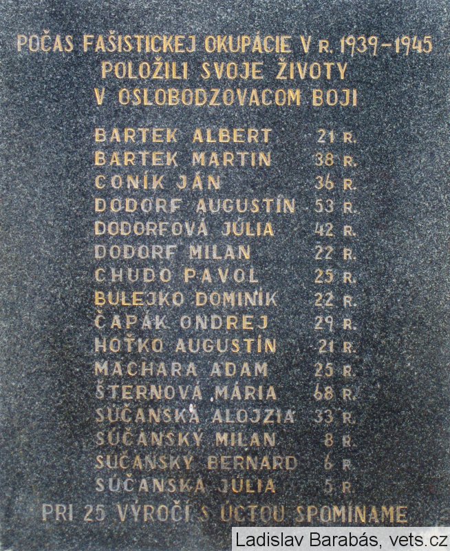 BARTEK ALBERT 21 R. BARTEK MARTIN 38 R. CONÍK JÁN 36 R. DODORF AUGUSTÍN 53 R. DODORFOVÁ JÚLIA 42 R. DODORF MILAN 22 R. CHUDO PAVOL 25 R. BULEJKO DOMINIK 22 R. ČAPÁK ONDREJ 29 R. HOŤKO AUGUSTÍN 21 R. MACHARA ADAM 25 R. ŠTERNOVÁ MÁRIA 68 R. SÚČANSKÁ ALOJZIA 33 R. SÚČANSKÝ MILAN 8 R. SÚČANSKÝ BERNARD 6 R. SÚČANSKÁ JÚLIA 5 R.