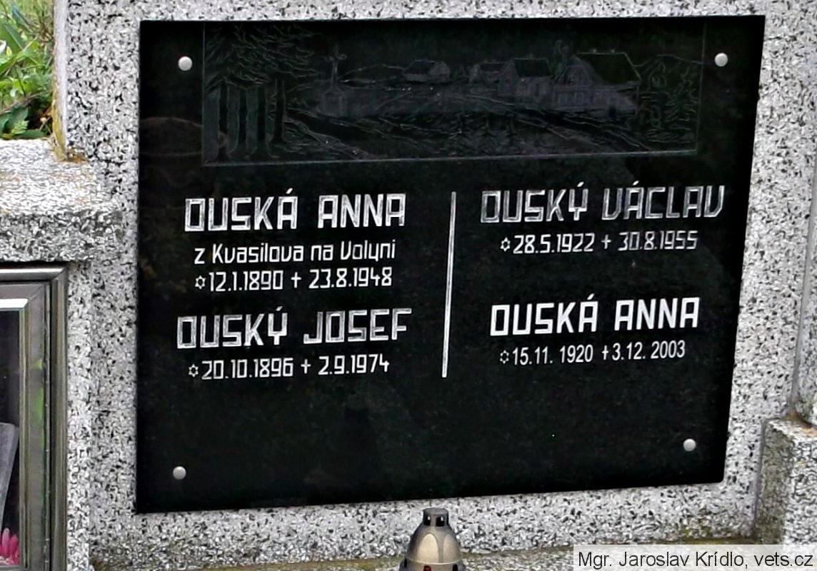 Ouský Mikuláš, vojín, nar. 30.1.1926, Kvasilov, Volyň, kmenové číslo 7.875/M, příslušník 2. čs. samostatná paradesantní brigáda v SSSR. Odveden 16.03.1944, Jefremov, česká. Padl 30.10.1944, Slovensko, Kozí Chrbát.