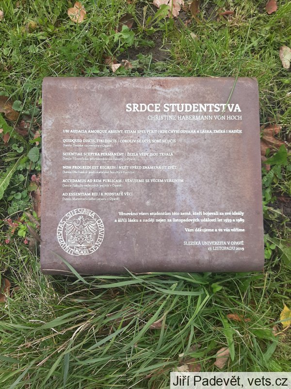 na desce: SRDCE STUDENTSTVA / CHRISTINE HABERMANN VON HOCH / UBI AUDACIA AMORQUE ABSUNT, ETIAM SPES PERIT / KDE CHYBÍ ODVAHA A LÁSKA, ZMÍRÁ I NADĚJE / QUIDQUID DISCIS, TIBI DISCIS / COKOLIV SE UČÍŠ, SOBĚ SE UČÍŠ (heslo Slezské univerzity v Opavě) SCIENTIAE SCEPTRA PERMANENT / ŽEZLA VĚDY JSOU TRVALÁ (heslo Filozofiko-přírodovědecké fakulty v Opavě) NON PROGREDI EST REGREDI / NEJÍT VPŘED ZNAMENÁ JÍT ZPĚT (heslo Obchodně-podnikatelské fakulty v Karviné) ACCEDAMUS AD REM PUBLICAM / VĚNUJEME SE VĚCEM VEŘEJNÝM (heslo Fakulty veřejných politik v Opavě) AD ESSENTIAM REI / K PODSTATĚ VĚCI (heslo Matematické fakulty v Opavě) Věnováno všem studentům této země, kteří bojovali za své ideály a šířili lásku a naději nejen za listopadových událostí let 1939 a 1989. Vám děkujeme a ve vás věříme. SLEZSKÁ UNIVERZITA V OPAVĚ 17. LISTOPADU 2019