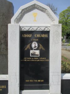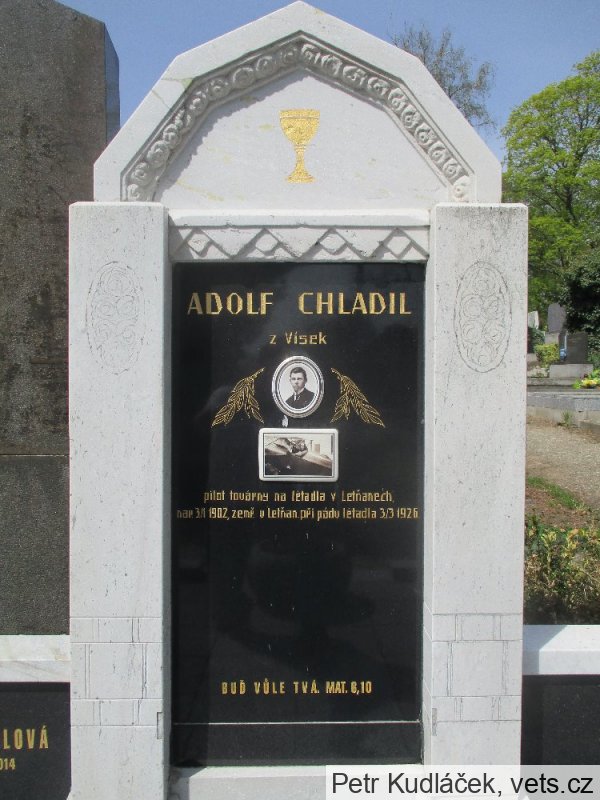 Adolf Chladil se narodil 3.1.1902 v obci Vísky, okr. Blansko, pilotní výcvik v Chebu ukončil v září 1923, poté sloužil u LP2 v Olomouci, a od března 1924 u LP1 v Praze. Dne 1.3 1924 byl des. Adolf Chladil od LP1 jmenován Polním pilotem letcem (uvedeno ve Věstníku MNO 1924, část osobní, str. 410). V říjnu 1925 odešel do zálohy a v lednu 1926 nastoupil jako tovární pilot do Vojenské továrny na letadla v Praze (od října 1926 Letov). Jeho fotografie v letadle Avia BH-17 na pomníku musí pocházet z doby vojenské služby, protože jako tovární pilot už létal s letadly svého zaměstnavatele, a zahynul v letadle Letov Š-20.