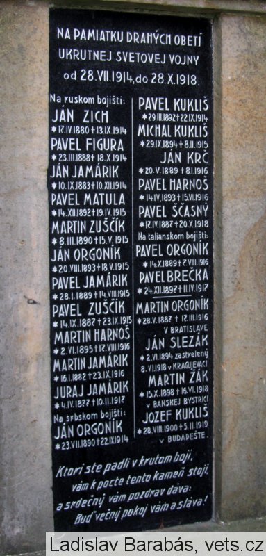 JÁN ZICH *17.IV.1880 †13.IX.1914, PAVEL FIGURA *23.III.1888 †18.X.1914, JÁN JAMÁRIK *10.IX.1880 †10.XII.1914, PAVEL MATULA *14.XII.1892 †19.IV.1915, MARTIN ZUŠČÍK *8.III.1890 †15.V.1915, JÁN ORGONÍK *20.VIII.1893 †18.V.1915, PAVEL JAMÁRIK *28.I.1889 †14.VIII.1915, PAVEL ZUŠČÍK *14.IX.1887 †23.IX.1915, MARTIN HARNOŠ *2.VI.1895 †17.VIII.1916, MARTIN JAMÁRIK *16.I.1882 †23.IX.1916, JURAJ JAMÁRIK *4.IV.1877 †10.II.1917