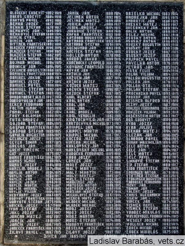 ALBRECHT ĽUDEVÍT 1892 1919, BAKOŠ ĽUDEVÍT 1884 1916, BARTOŠ PAVEL 1892 1916, BENKA JOZEF 1877 1915, BENKOVIČ JÁN 1885 1915, BENKOVIČ ŠTEFAN 1886 1914, BINČÍK CYRIL 1893 1915, BINČÍK JÁN 1894 1915, BITTNER FRANTIŠEK 1892 1916, BLAŽÍČEK FRANTIŠEK 1896 1919, BLAŽÍČEK ŠTEFAN 1890 1915, BLAŽÍČEK ŠTEFAN 1882 1915, BLAŽÍČEK MICHAL 1885 1916, BOJNAR MICHAL 1894 1915, BIMICH JÁN 1894 1915, CICHNER AUGUSTÍN 1888 1915, DANIHEL JAKUB 1885 1917, DANIHEL JOZEF 1877 1915, DANIHEL PAVEL 1890 1914, DANIHEL ŠTEFAN 1897 1919, DANIHEL ŠTEFAN 1882 1915, DOBROVODSKÝ ALOJZ 1897 1918, DOBROVODSKÝ JÁN 1892 1915, ECKER FERDINAND 1897 1918, FOLTIN IGNAC 1883 1916, FONAL ŠTEFAN 1887 1914, FRAY KOLOMAN 1890 1915, FUTO ONDREJ 1888 1915, GAJDÁR ŠTEFAN 1884 1915, GAŠPAR FRANTIŠEK 1897 1917, GAŠPAR ŠTEFAN 1885 1915, GAVALÍK AUGUSTÍN 1886 1915, GELINGER JOZEF 1893 1915, GEYER ŠIMON 1887 1915, GREGOS jÁN 1892 1915, GREIF VINCENC 1897 1918, GUT JOZEF 1875 1917, HANUŠ FRANTIŠEK 1882 1915, HANUŠ IGNÁC 1880 1914, HANUŠ JOZEF 1884 1918, HANZLÍK ONDREJ 1874 1916, HAVLÍK ANTON 1894 1915, HAVLÍK JÁN 1884 1917, HAVLÍK JÁN 1875 1916, HAVLÍK JOZEF 1898 1918, HAVLÍK MARTIN 1879 1917, HAVLÍK MICHAL 1885 1915, HAVLÍK VILIAM 1894 1915, HEDVÁBNY JOZEF 1883 1915, HORVAT FRANTIŠEK 1886 1916, HORVATH ŠTEFAN 1875 1916, HRICKA JOZEF 1871 1916, IVAN ŠTEFAN 1882 1914, JAKL JOZEF 1872 1917, JANČÍK JÁN 1891 1917, JANČÍK JOZEF 1887 1915, JANEČEK FRANTIŠEK 1893 1915, JANÍK JAN 1880 1914, JELINEK ARTÚR 1892 1915, JELINEK MATEJ 1899 1918, JURICA JOZEF 1888 1917, JURIK ONDREJ 1894 1915, JURKOVIČ ŠTEFAN 1888 1916, KAFKA FRANTIŠEK 1885 1916, KATRABA AUGUSTÍN 1894 1915, KATRABA FRANTIŠEK 1882 1916, KATRABA ŠTEFAN 1891 1914, KOCMUNDA JÁN 1882 1916, KOČÍŠEK ŠTEFAN 1894 1915, KOLLER ANTON 1878 1916, KORDOŠ JAKUB 1899 1915, KORCHACKÝ LEOPOLD 1883 1914, KOVANIČ FRANTIŠEK 1883 1918, KOVÁR JÁN 1886 1914, KOŽUCH JAN 1891 1915, KOŽUCH JÁN 1887 1914, KOŽUCH JOZEF 1894 1915, KOŽUCH MATEJ 1993 1914, KOŽUCH ŠTEFAN 1896 1917, KOŽUCH ŠTEFAN 1887 1915, KRÁL ALBERT 1895 1916, KRÁL ANTON 1880 1915, KRÁL JÁN 1898 1916, KRÁL JÁN 1878 1917, KRÁL ONDREJ 1895 1917, KRÁL VENDELÍN 1882 1918, KRATOCHVILA JÁN 1878 1915, KRATOCHVILA MICHAL 1873 1917, KRIPPEL JÁN 1896 1918, KRIPPEL MARTIN 1878 1916, KRIPPEL MICHAL 1887 1917, KUČERA JOZEF 1893 1917, KUČERA MICHAL 1884 1918, KUKLOVSKÝ JÁN 1887 1914, KUKLOVSKÝ MICHAL 1886 1915, KURAČKA FERDINAND 1885 1916, KÚRA JOZEF 1879 1915, LONČEK JÁN 1886 1916, MALÝ JOZEF 1881 1916, MALÝ MARTIN 1892 1915, MALÝ MARTIN 1873 1916, MALÝ MATEJ 1895 1917, MALÝ ŠTEFAN 1892 1915, MARCINEC JÁN 1894 1918, MATUŠEK ANTON 1888 1915, MATUŠEK JOZEF 1880 1916, MAXIAN MARTIN 1879 1916, MICHALOVIČ ŠTEFAN 1881 1914, MIZNER MATEJ 1882 1917, MLÁDEK MICHAL 1897 1916, MLÁDEK MICHAL 1883 1916, MRÁZ JOZEF 1895 1916, MRÁZ JOZEF 1882 1914, MRÁZ MARTIN 1893 1915, MRÁZ ŠTEFAN 1874 1916, MURANYI FRANTIŠEK 1896 1915, OBSELKA JOZEF 1891 1915, OBSELKA MICHAL 1883 1914, ONDREJKA JÁN 1895 1915, ONDROVIČ JÁN 1895 1915, ORESKÝ MATEJ 1880 1917, OREŠANSKÝ JÁN 1889 1914, ORLÍK ANTON 1898 1917, OSLEJ MICHAL 1887 1918, OSUSKÝ ANTON 1896 1915, OSUSKÝ ANTON 1896 1915, OSUSKÝ AUGUSTÍN 1895 1916, OSUSKÝ JÁN 1890 1916, OSUSKÝ JOZEF 1887 1915, OSUSKÝ JOZEF 1883 1918, PAJPACH PAVEL 1880 1915, PAVELKA ANTON 1876 1919, PETRÁŠ JÁN 1885 1915, PISSK FELIX 1884 1916, POLÁK VILIAM 1894 1915, POLLÁK AUGUSTÍN 1895 1918, POLLÁK JÁN 1876 1917, POLLÁK OTO 1898 1914, POLLÁK ŠTEFAN 1882 1916, PROCHAZKA PAVEL 1892 1915, PROKOP JÁN 1892 1916, REISNER ALFRED 1882 1919, REŽNÝ JOZEF 1887 1916, ROHLÍČEK FERDINAND 1892 1915, ROHLÍČEK VILIAM 1898 1918, ROSENSTEIN ARTÚR 1887 1917, ROŠ ĽUDOVÍT 1889 1915, RYBA JOZEF 1896 1916, RYBA JÚLIUS 1896 1916, SEČKÁR MATEJ 1894 1919, SLEZÁK JÁN 1896 1915, SLOBODA PAVEL 1890 1915, ŠURAN MAXIMILIAN 1884 1915, ŠELC ANTON 1884 1914, ŠELC JÁN 1894 1917, ŠELC MATEJ 1889 1915, ŠELC PAVEL 1890 1915, ŠIMKOVIČ ŠTEFAN 1894 1915, ŠÍP ŠTEFAN 1888 1917, ŠÍRA FRANTIŠEK 1894 1915, ŠPRINGER ANTON 1879 1916, ŠTIFTNER ŠTEFAN 1892 1915, ŠTOKONGER AUGUSTÍN 1882 1918, TABORSKY FERDINAND 1889 1915, TICHY JÁN 1883 1918, TOMAN JÁN 1890 1915, VALENT JOZEF 1882 1916, VANIŠ ALEXANDER 1885 1915, VILEM JÁN 1897 1916, VINCEK JÁN 1874 1915, VISMEK PAVEL 1897 1918, VISMEK ŠTEFAN 1892 1915, VRABEC MIKULÁŠ 1892 1920, WASSERVOGELFRIDRICH 1894 1915, WESELÝ JOZEF 1896 1916, WOLLNER MICHAL 1892 1914, ZÚBEK MICHAL 1879 1916, ZÚBEK MIKULÁŠ 1875 1915, ŽDIMAL JÁN 1879 1916, ŽILAVÝ JOZEF 1897 1917, ŽILAVÝ PAVEL 1887 1915, ŽIVICA JÁN 1895 1917