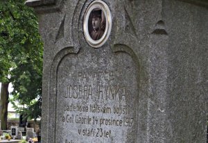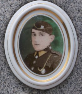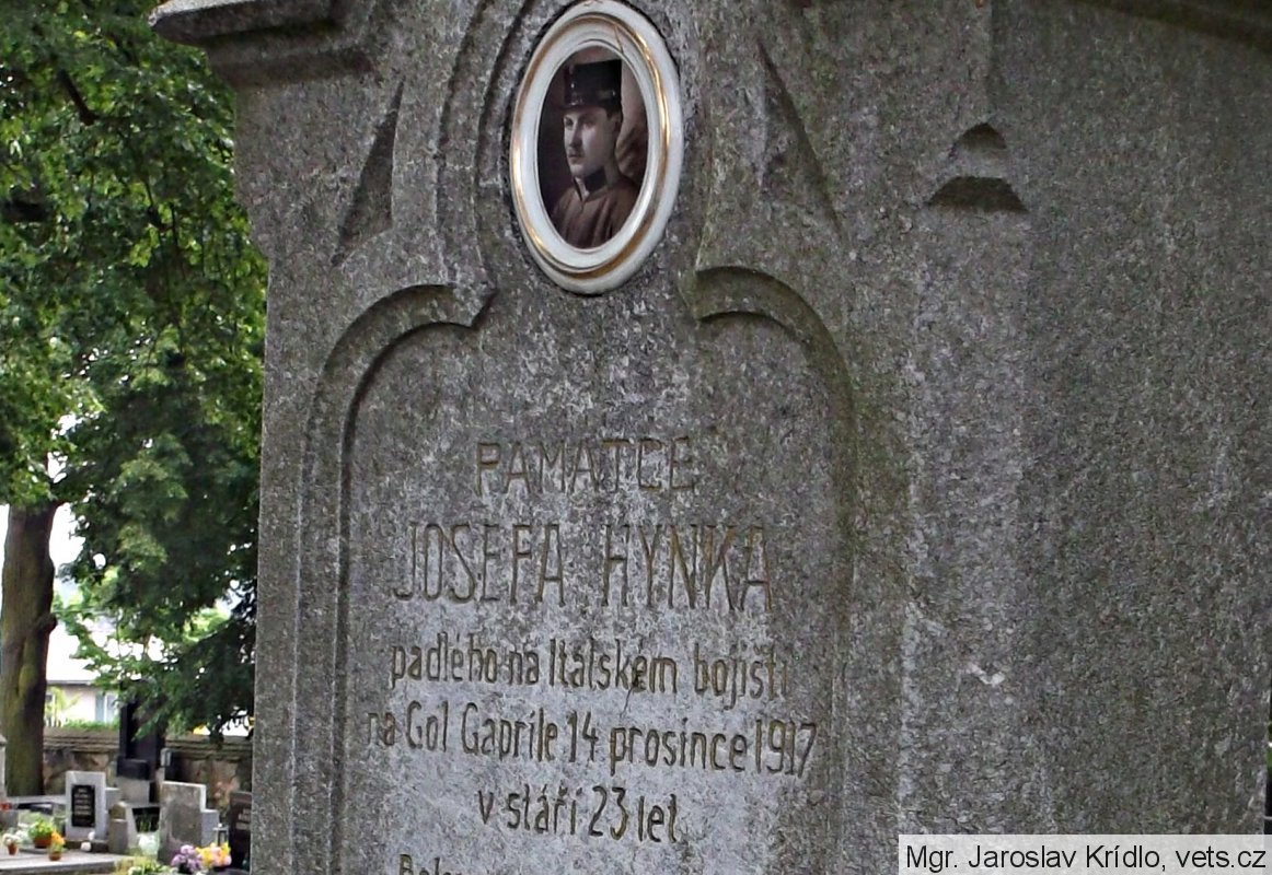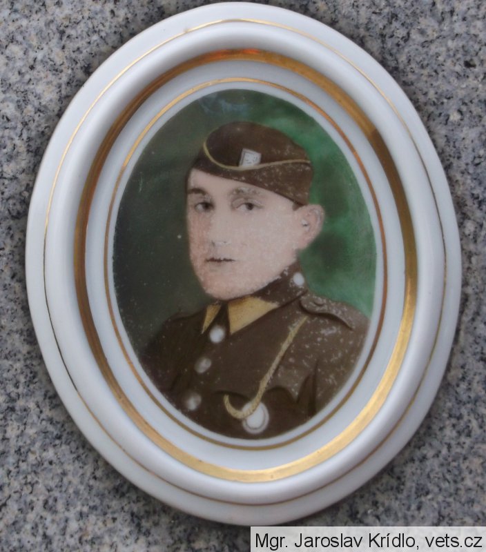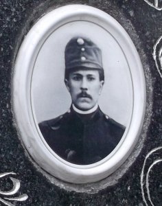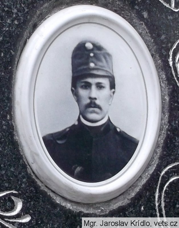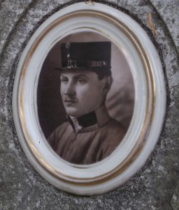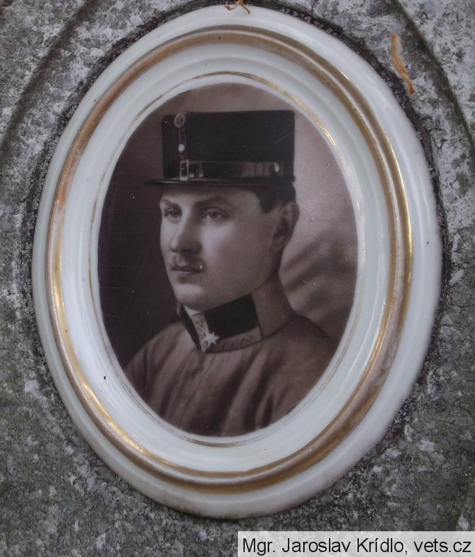 foto vojáka Rakousko-uherské armády, v poddůstojnické hodnosti kadet - důstojnický zástupce; náhrobek s chybou popisuje místo skonu, mělo být uvedeno "na Col Caprile"