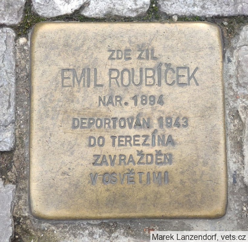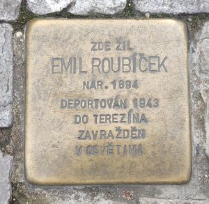 Emil Roubíček, narozen 26. 1. 1894. Poslední bydliště před deportací Praha V. Adresa/místo registrace v Protektorátu Praha I, Norimberská 34. Transport Dh, č. 397 (8. 7. 1943, Praha-Terezín). Transport El, č. 1335 (29. 9. 1944, Terezín-Osvětim). Zahynul.