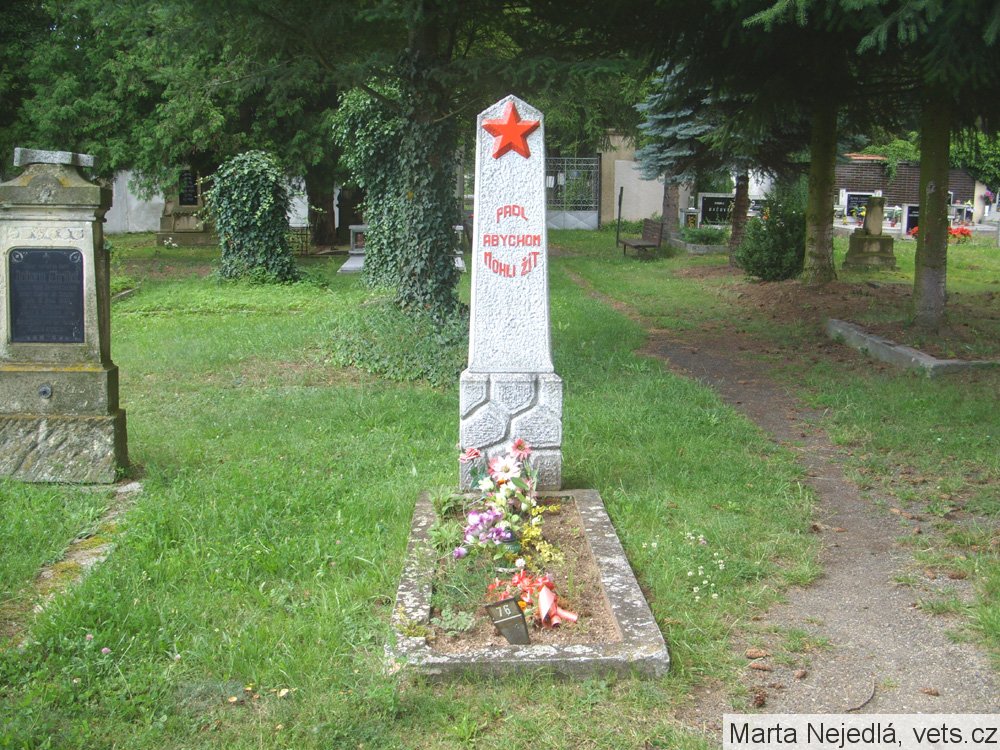 V tomto případě se archivní materiály rozcházejí (výčty válečných hrobů ze 70. let v okrese Louny). První uvádí „na místním hřbitově je společný hrob sovětských vojáků. Hrob má pomník z kamene s nápisem a hvězdou. Je vzorně udržován.“ Druhý uvádí, že jde o „hrob neznámého vojáka RA.“ Přikláním se k názoru, že jde o hrob jednotlivý, neboť popis z prvního výčtu souhlasí se skutečným stavem hrobu, nicméně nápis (resp. použitý singulár)„PADL, ABYCHOM MOHLI ŽÍT“ na náhrobku svědčí spíše o skutečnosti, že jde o hrob jednoho vojáka (zdroj databáze CEVH MO ČR)