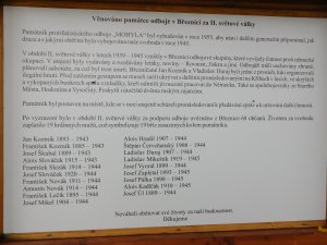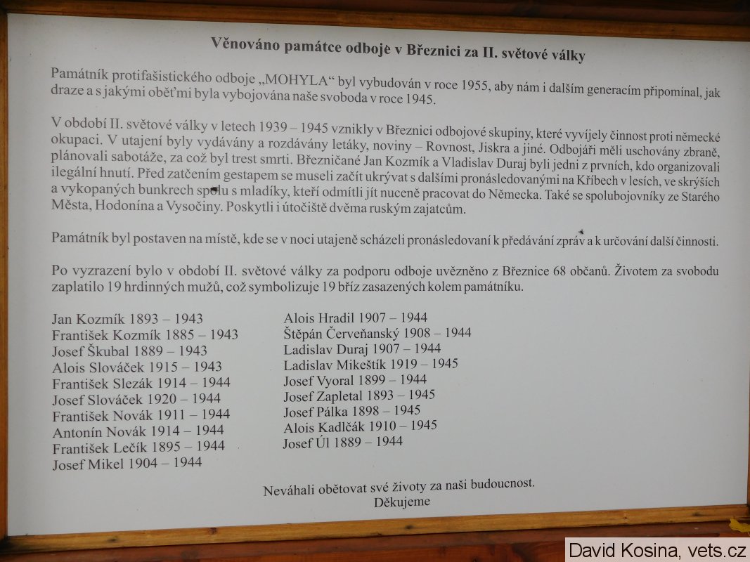 Jedná se o pomník zvaný "MOHYLA" a vybudovaný v roce 1955 na památku velmi výrazného ilegálního odbojového hnutí, které bylo za 2. světové války aktivní v Březnici a okolí. Na informační tabuli instalované u pomníku je uvedeno jmenovitě 19 obětí nacistického mučení a koncentračních táborů, které mají své podobenky na pomníku v obci Březnice u Kostela sv. Bartoloměje: http://www.vets.cz/vpm/27530-pomnik-obetem-1-a-2-svetove-valky-a-vojakum-rude-a-rumunske-armady/#27530-pomnik-obetem-1-a-2-svetove-valky-a-vojakum-rude-a-rumunske-armady