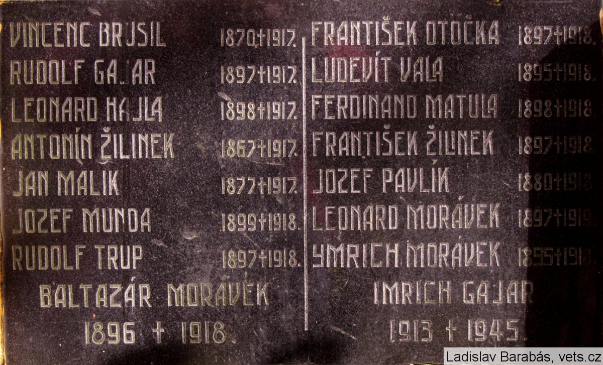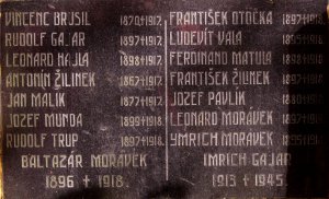 VINCENC BRUSIL 1870 †1917. RUDOLF GAJAR 1897 †1917. LEONARD HAJLA 1897 †1917. ANTONÍN ŽILINEK 1867 †1917. JAN MALIK 1877 †1917. JOZEF MUNDA 1899 †1918. RUDOLF TRUP 1897 †1918. BALTAZÁR MORÁVEK 1896 †1918. FRANTIŠEK OTOČKA 1897 †1918. LUDEVIT VALA 1895 †1918. FERDINAND MATULA 1898 †1918. FRANTIŠEK ŽILINEK 1897 †1918. JOZEF PAVLÍK 1880 †1918. LEONARD MORÁVEK 1897 †1919. YMRICH MORÁVEK 1895 †1918. IMRICH GAJAR 1913 †1945.