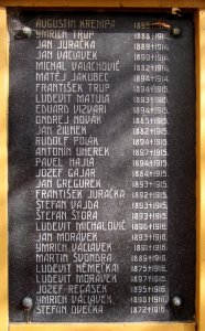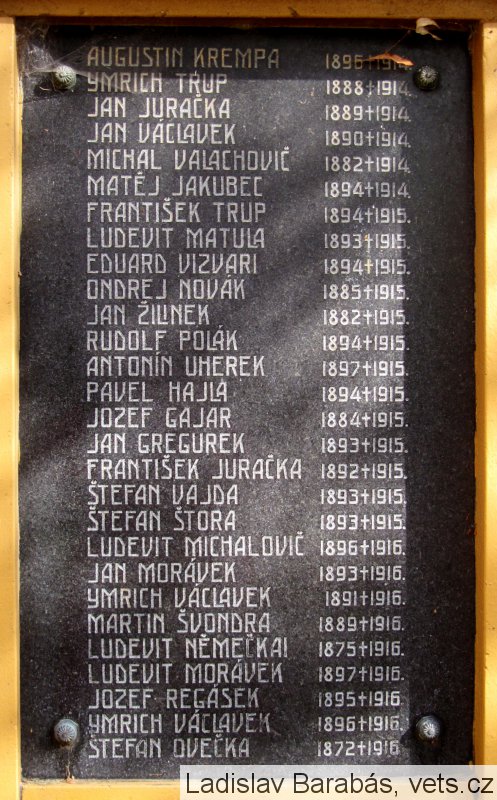 AUGUSTIN KREMPA 1896 †1914. YMRICH TRUP 1888 †1914. JAN JURAČKA 1889 †1914. JAN VÁCLAVEK 1890 †1914. MICHAL VAACHOVIČ 1882 †1914. MATĚJ JAKUBEC 1894 †1914. FRANTIŠEK TRUP 1894 †1915. LUDEVIT MATULA 1893 †1915. EDUARD VIZVARI 1894 †1915. ONDREJ NOVÁK 1885 †1915. JAN ŽILINEK 1882 †1915. RUDOLF POLÁK 1894 †1915. ANTONÍN UHEREK 1897 †1915. PAVEL HAJLA 1894 †1915. JOZEF GAJAR 1884 †1915. JAN GREGUREK 1893 †1915. FRANTIŠEK JURAČKA 1892 †1915. ŠTEFAN VAJDA 1893 †1915. ŠTEFAN ŠTORA 1893 †1915. LUDEVIT MICHALOVIČ 1896 †1916. JAN MORÁVEK 1893 †1916. YMRICH VÁCLAVEK 1891 †1916. MARTIN ŠVONDRA 1889 †1916. LUDEVIT NĚMEČKAI 1875 †1916. LIDEVIT MORÁVEK 1897 †1916. JOZEF RAGÁSEK 1895 †1916. YMRICH VÁCLAVEK 1896 †1916. ŠTEFAN OVEČKA 1872 †1916.