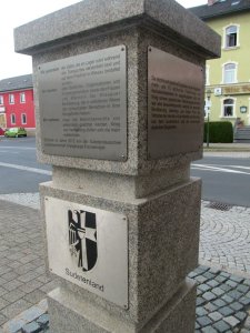 Děkujeme všem orgánům, organizacím a farnostem a mužům a ženám z Wiesenau, kteří pomáhali nezištným způsobem vykořeněným lidem v jejich nouzi. Připomínáme, že lidská práva platí pro každého. Válka nesmí se nikdy opakovat. Postaveno v roce 2012 sudetoněmeckým sdružením Kreisgruppe Tirschenreuth.