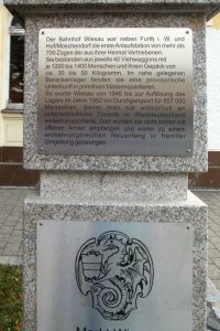 Umístění: Wiesau, Tonwerkstraße, před budovou nádražíDer Bahnhof Wiesau war neben Furth i. W. und Hof/Moschendorf die erste Anlaufstation von mehr als 700 Zügen der aus ihrer Heimat Vertriebenen. Sie bestanden aus jeweils 40 Viehwaggons mit je 1200 bis 1400 Menschen und ihrem Gepäck von 1 ca. 30 bis 50 Kilogramm. Im nahe gelegenen Barackenlager fanden sie eine provisorische Unterkunft in primitiven Massenquartieren. So wurde Wiesau von 1946 bis zur Auflösung des Lagers im Jahre 1952 ein Durchgangsort für 857 000 Menschen, bevor man sie willkürlich an unterschiedliche Zielorte in Westdeutschland weitertransportierte. Dort wurden sie nicht immer mit offenen Armen empfangen und waren zu einem entbehrungsreichen Neuanfang in fremder Umgebung gezwungen.