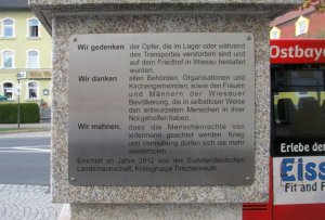 Wir gedenken der Opfer, die im Lager oder während des Transportes verstorben sind und auf dem Friedhof in Wiesau bestattet wurden. Wir danken allen Behörden, Organisationen und Kirchengemeinden. sowie den Frauen und Männern der Wiesauer Bevölkerung, die in selbstloser Weise den entwurzelten Menschen in ihrer Not geholfen haben. Wir mahnen, dass die Menschenrechte von jedermann geachtet werden. Krieg und Vertreibung dürfen sich nie mehr wiederholen. Errichtet im Jahre 2012 von der Sudetendeutschen Landsmannschaft, Kreisgruppe Tirschenreuth
