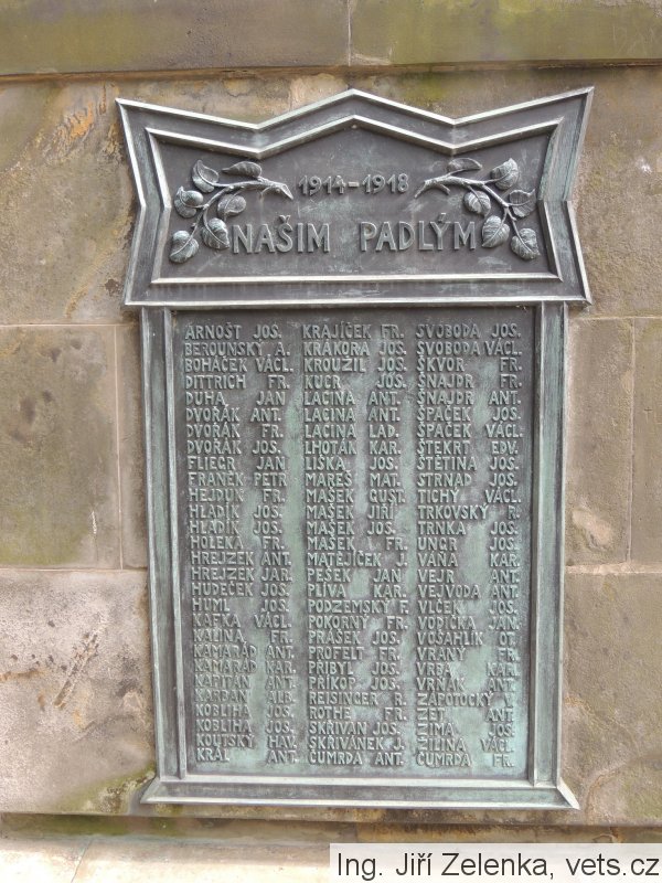 CZE0012-18865 - Bronzová deska věnovaná padlým v 1. sv. válce. Pamětní deska byla pořízena na náklad obce roku 1928 a umístěna na budovu školy v Radniční ulici. V roce 1989 byla přemístěna z důvodu demolice školy na boční stranu pomníku barikádníka u ZŠ T.G. Masaryka.