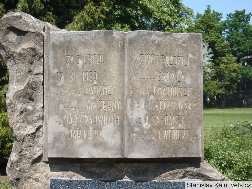 ZA SVOBODU ŽIVOT POLOŽILI, 17.11.1939, JUDr. in. mem. J. ADAMEC, MUDr. in. mem. JAN ČERNÝ, Ing. MAR. FRAUWIRTH, JUDr. JAR. KLÍMA, JUDr. in. mem. B. KOULA, Doc. PhDr. J. MATOUŠEK, JUDr. FR. SKORKOVSKÝ, ING. C. V. ŠAFRÁNEK, PhDr. in. mem. prof. J. WEINERT
