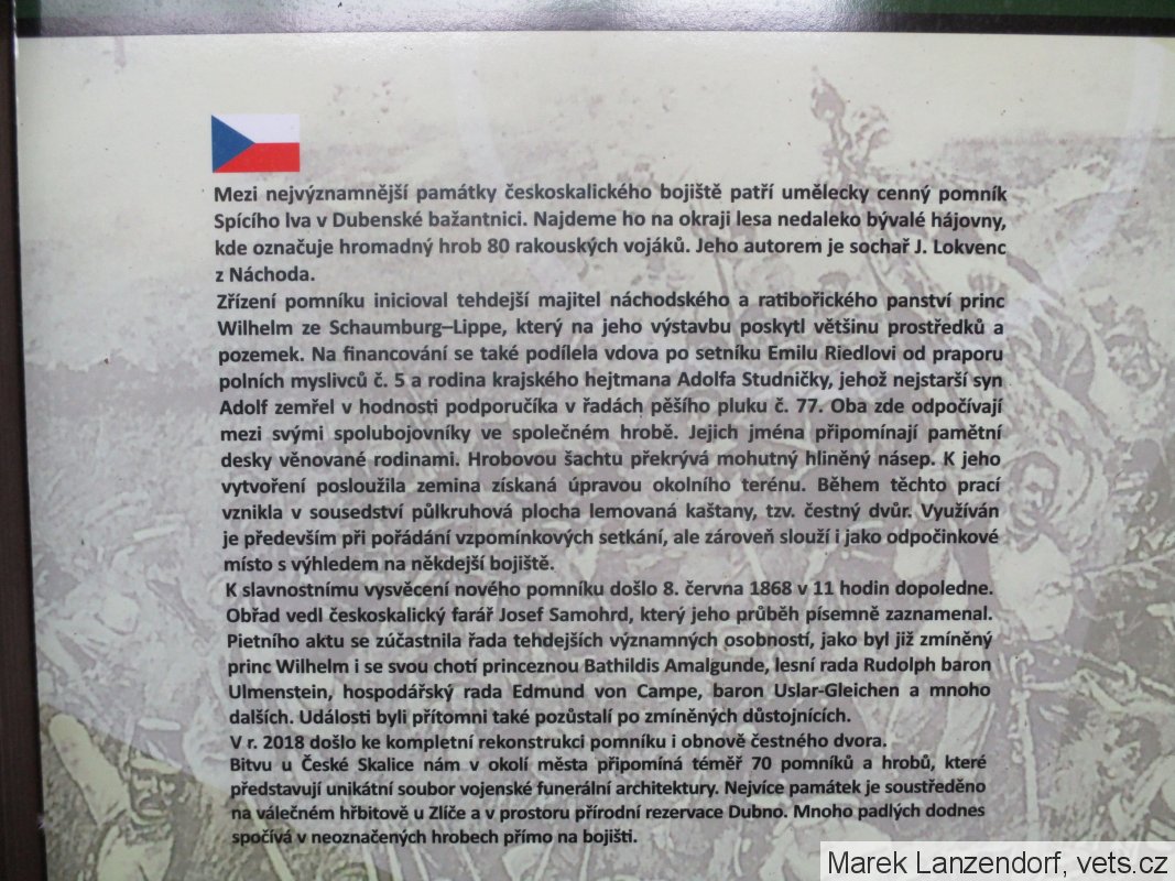 Mezi nejvýznamnější památky českoskalického bojiště patří umělecky cenný pomník Spícího lva v Dubenské bažantnici. Najdeme ho na okraji lesa nedaleko bývalé hájovny, kde označuje hromadný hrob 80 rakouských vojáků. Jeho autorem je sochař J. Lokvenc z Náchoda.