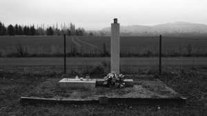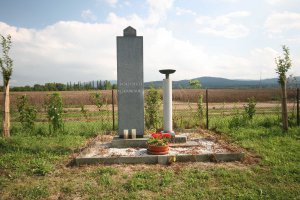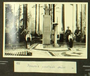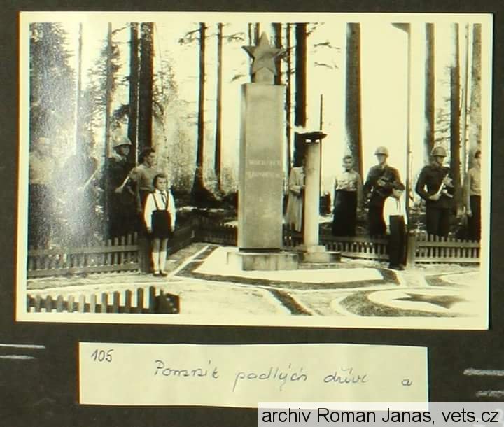Pomník na archivní fotografii, na které je zachycen pietní akt 31 umučených sovětských válečných zajatců v prostorách MUNY v Mikulovicích. Fotografie je z 9.5.1959. (zdroj: Roman Janas)