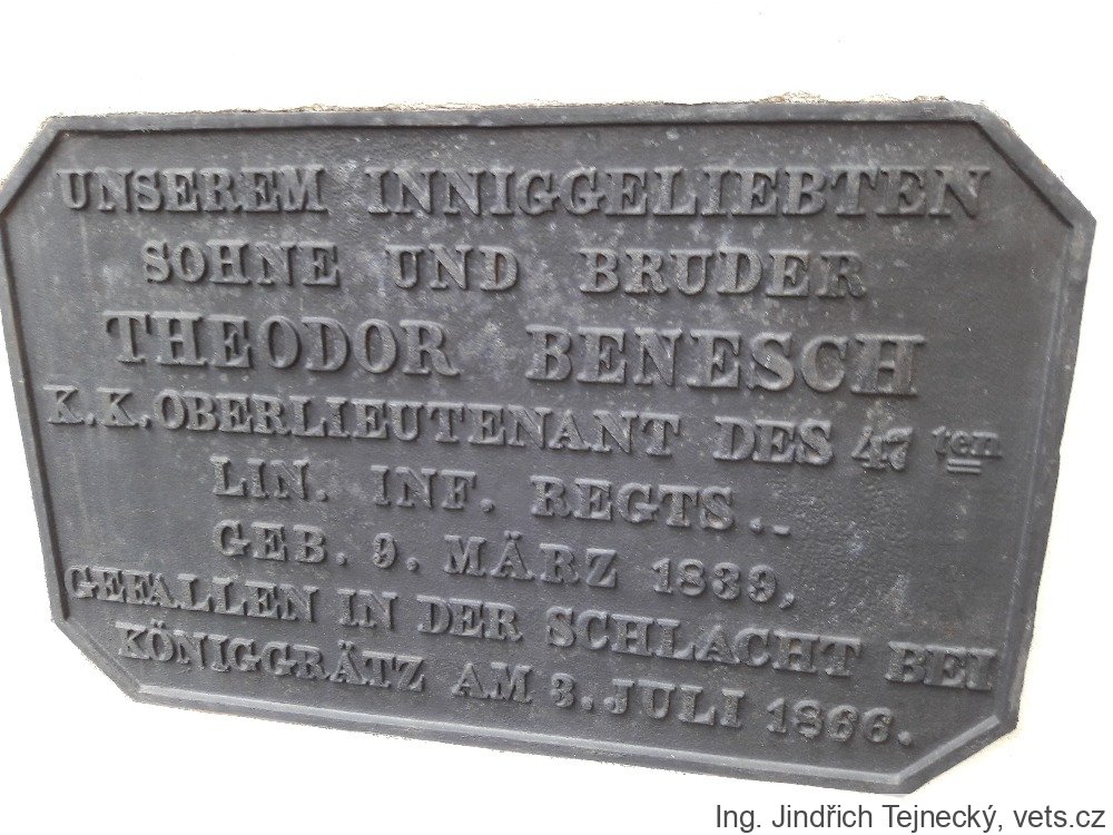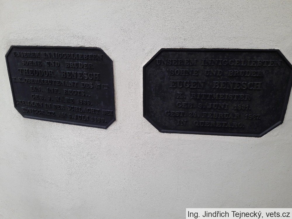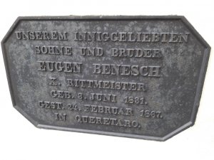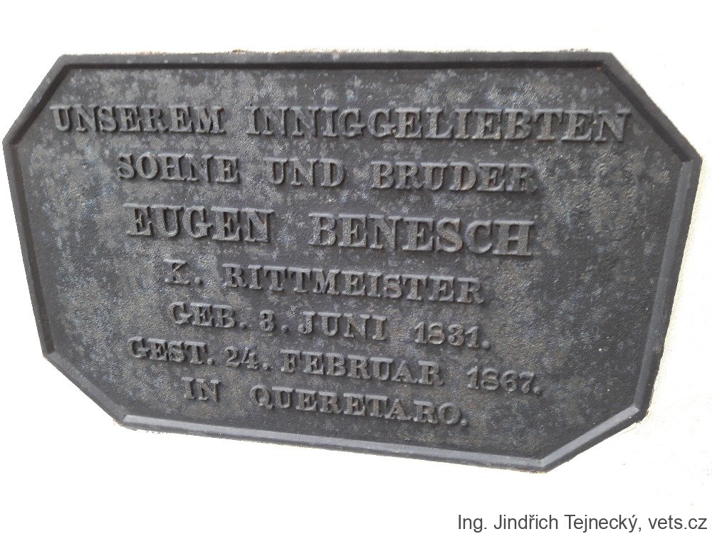 Překlad textu: Našemu vroucně milovanému synu a bratrovi rytmistru Eugenu Beneschovi. Narozen 3. června 1831, zemřel 24. února 1867 v Queretaru v Mexiku.