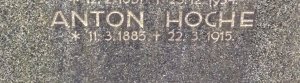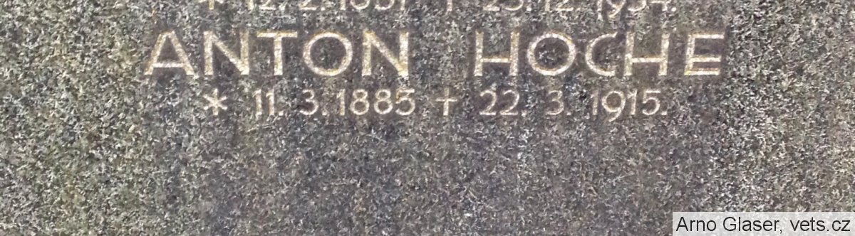 Hoche Anton: EinjFreiw.Inft., IR. Nr. 42, 1. ErsKomp. *1885, příslušný Willsdorf (dnes Vilsnice). +22.3.1915 GarnSpit. Nr. 13 Terezín na tetanus. Převezen a pohřben na zdejším hřbitově. (zdroj: VHÚ)