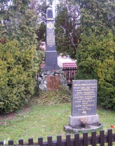 Památník je sestaven ze dvou samostatných pomníků. V pozadí pomník obětem 1. světové války (odhalen byl na konci července 1938), asi 2 metry před ním pomník (pamětní deska) obětem 2. světové války (odhalena 17. června 1946).
