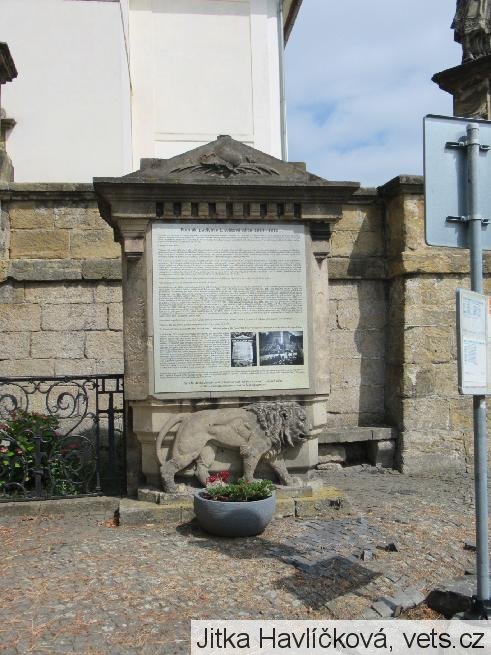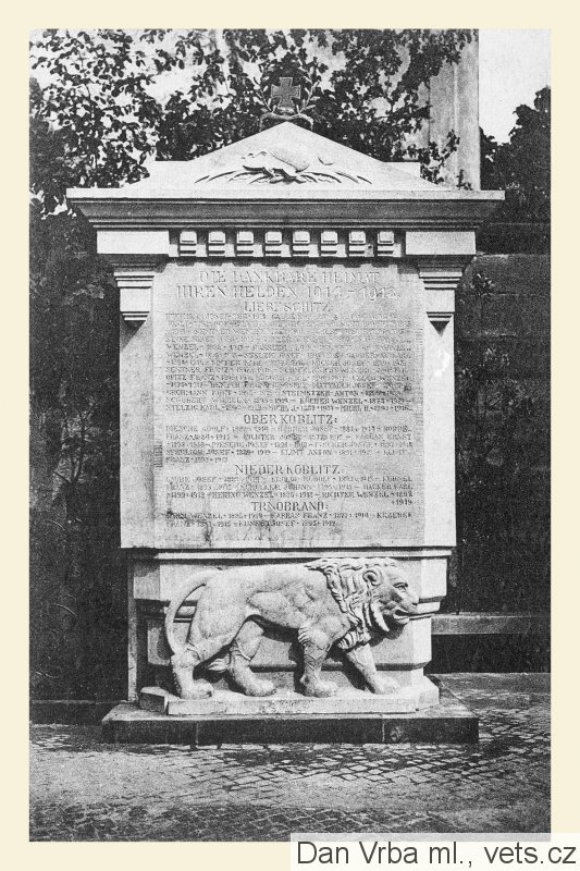 Nápis dle historické pohlednice - Die Dankbare Heimat Ihren Helden 1914-1918. Liebeschitz, Ober Koblitz, Nieder Koblitz, Trnobrand. Dále jsou uvedena jména padlých (z pohlednice nečitelná).