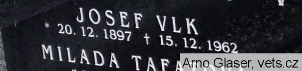Vlk Josef: *21.12.1897 (na náhrobku 20.12.), místo neuvedeno. Bydliště: Český Boratín, Volyňská gubernie. Student. Zařazení do legie: 31.7.1916. Legie: Čs. legie v Rusku. Útvar: 1. stř. pluk. Hodnost: vojín. Konec v legii: 1.4.1918. Propuštěn.