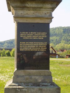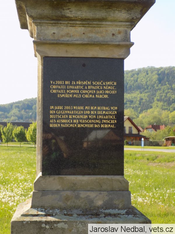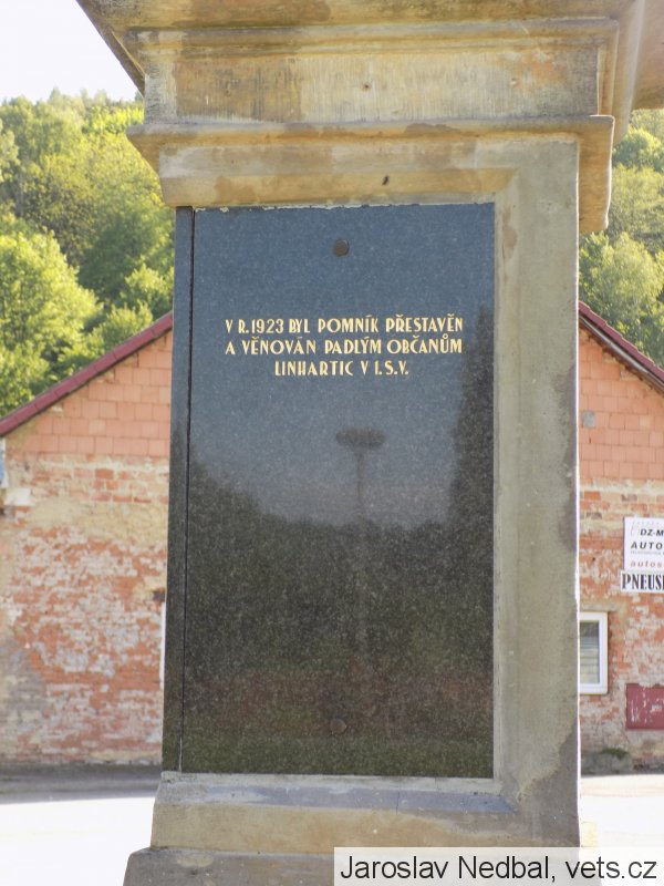 Umístění: Linhartice, střed obce, před budovou místní základní školy u mostu přes TřebůvkuZU EHREN UNSERER HELDEN 1914 – 1919