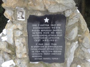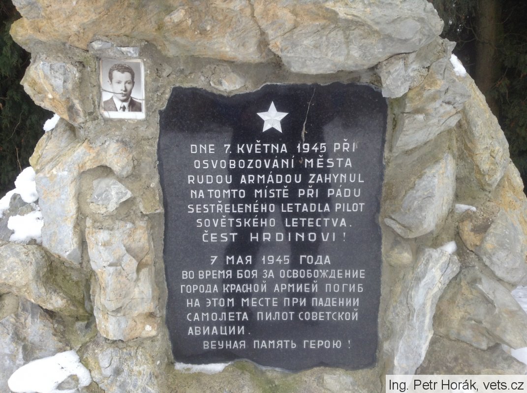 Pilot zahynul v troskách letadla, pohřben byl později na hřbitově sovětské armády v Olomouci ve zvláštním hrobě. (zdroj CEVH MO ČR)