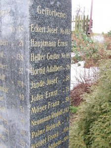 Hauptmann Ernst Karl: *22.3.1888 Reichen, č. p. 138, okr. Tetschen (Rychnov, okr. Děčín), do rodiny vrchního učitele Karla Kaspera Hauptmanna a Johanny Mathildy, roz. Palme. Svobodný, stavební technik. Zugsf., EisenbahnR. +7.4.1918 Altstadt, č. p. 78 (Staré Město, část Děčína), tbc. Převezen a zde 9.4.1918 pohřben. Místo i s kostelem 1975 zplanýrováno.