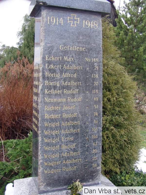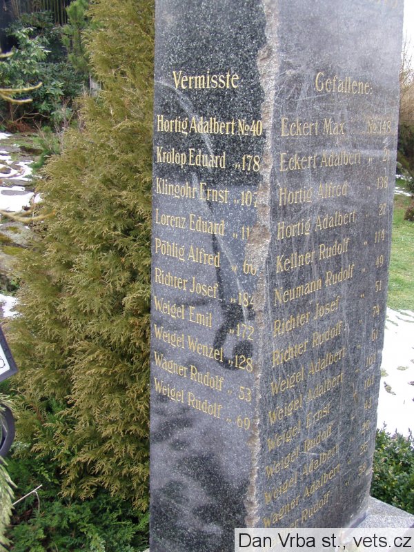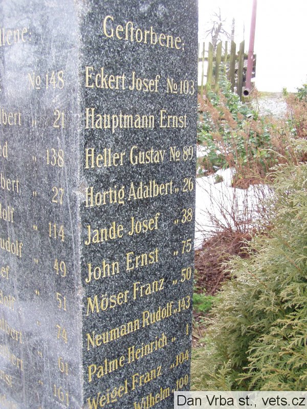 Jande Josef: *8.1.1886 Reichen, č. p. 38, okr. Tetschen (Rychnov, okr. Děčín). Svobodný, řezník. ResGefr., IR. Nr. 42, 9. Komp. +24.9.1918 ResSpit Teplitz Schönau (Teplice – Šanov), zánět ledvin. Převezen a 28.9.1918 zde pohřben. Místo r. 1975 zplanýrováno (kostel zbořen). Zrušeno.