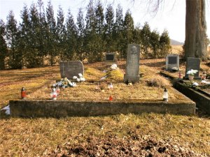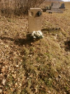 Umístění: Ostrá Lúka, cintorín na východnom okraji obce, vľavo od vchodu za evanjelickou časťou a trávnatým porastom v spodnom rohu katolíckej časti cintorína, prístup je možný aj zo severnej strany z Barborskej cestyNápis: